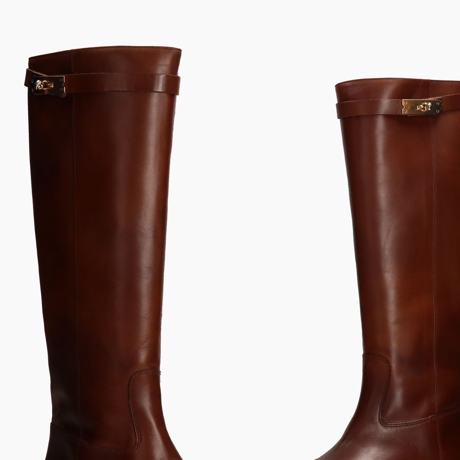 Tan leather boots with a removable strap and gold-tone metal toe cap. Internal zip closure. Leather lining. Shaft height: 39 cm (size 37) measured from the inside of the heel. Rubber sole with a 2.5 cm heel. Gaia Shoes women's Fall/Winter collection.