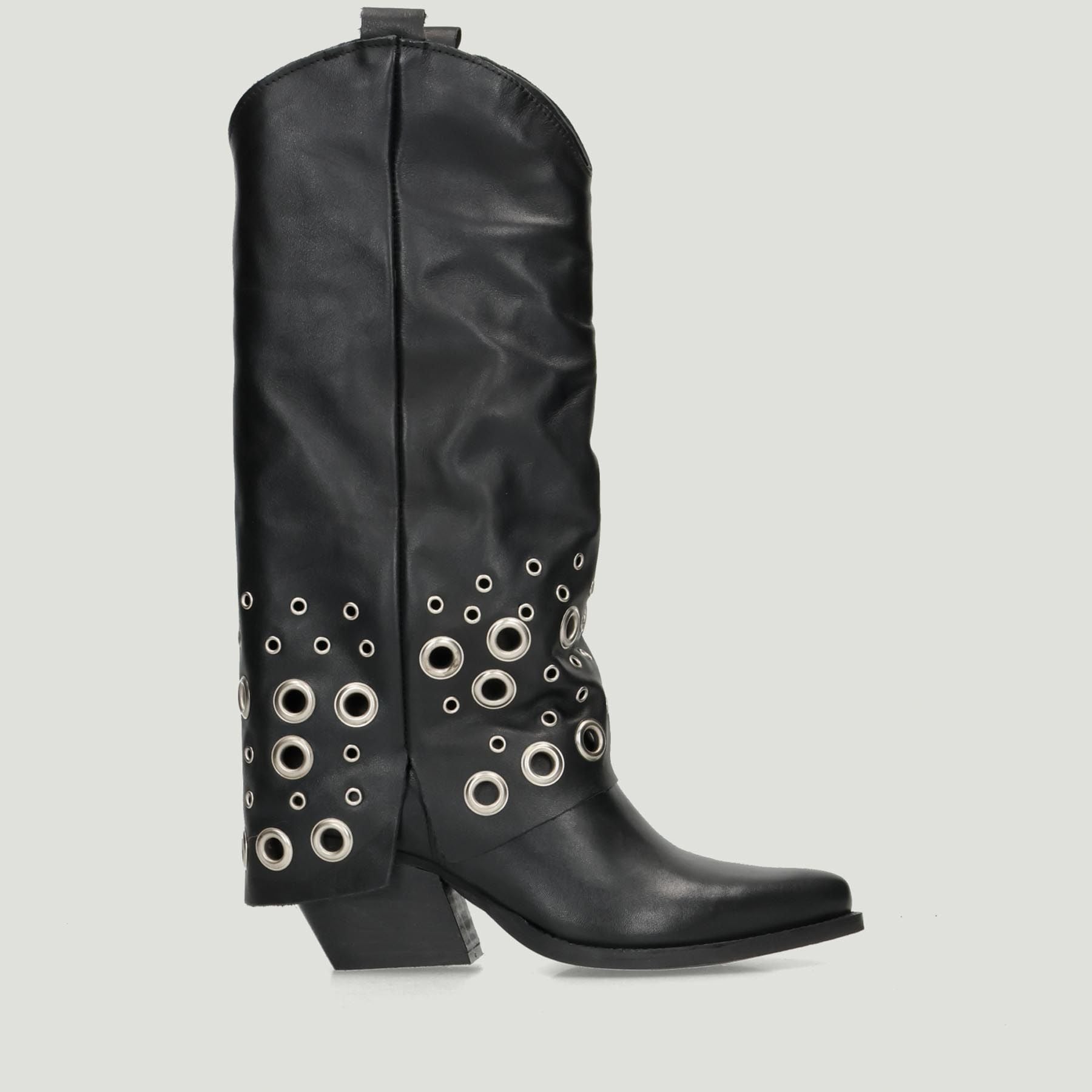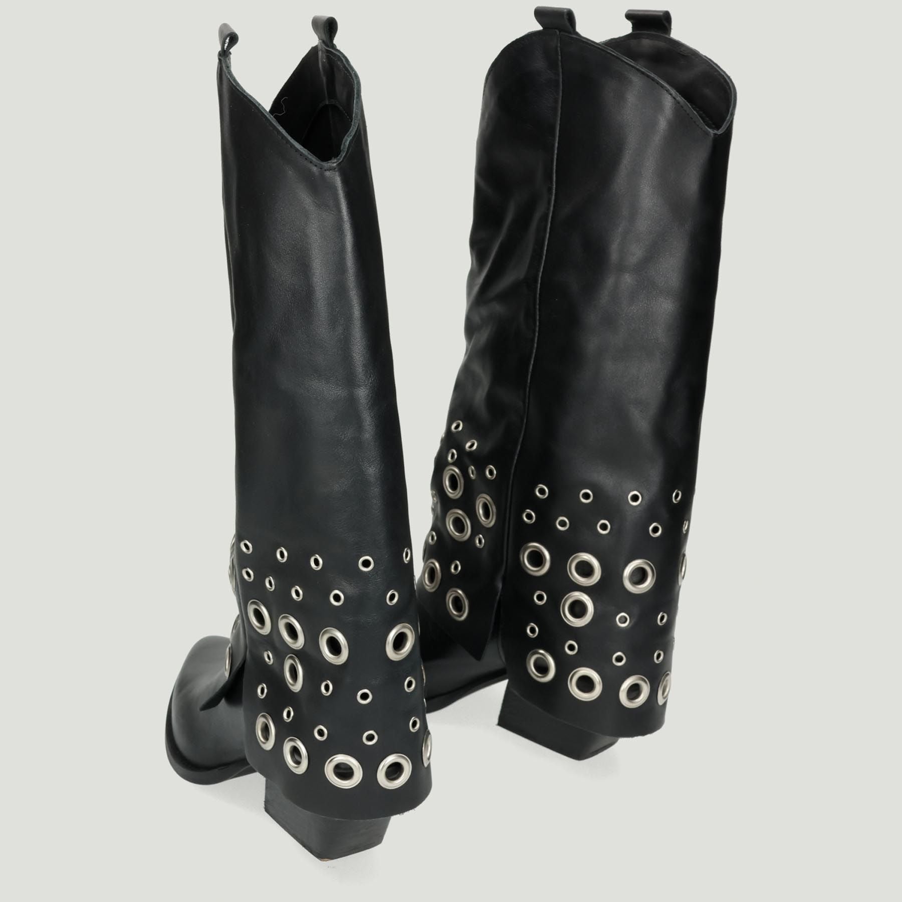 Black leather Texan tube boot with gaiter-style shaft and silver metal studs. Leather and fabric lining. Non-removable insole. Rubber sole with 5 cm heel. RPK women's collection.