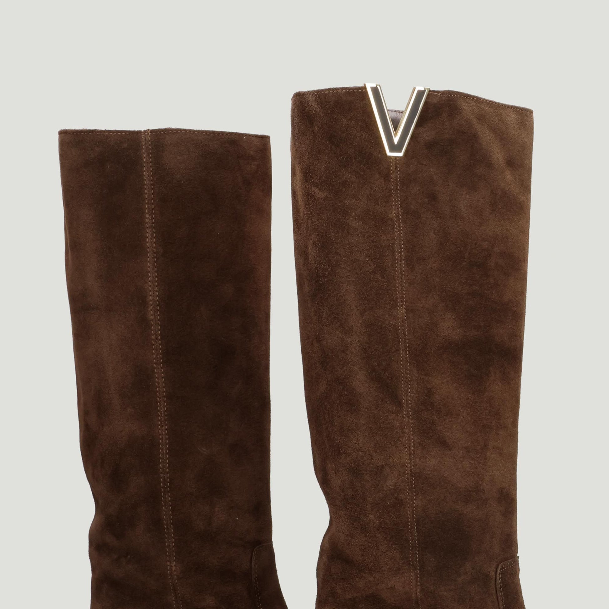 Dark brown suede tube boots with a V-shaped detail on the shaft. Leather lining. Shaft height: 36 cm (size 36) measured from the inside of the heel. Rubber sole with a 2 cm heel and a 3 cm internal wedge. Officine Bronx women's Fall/Winter collection.
