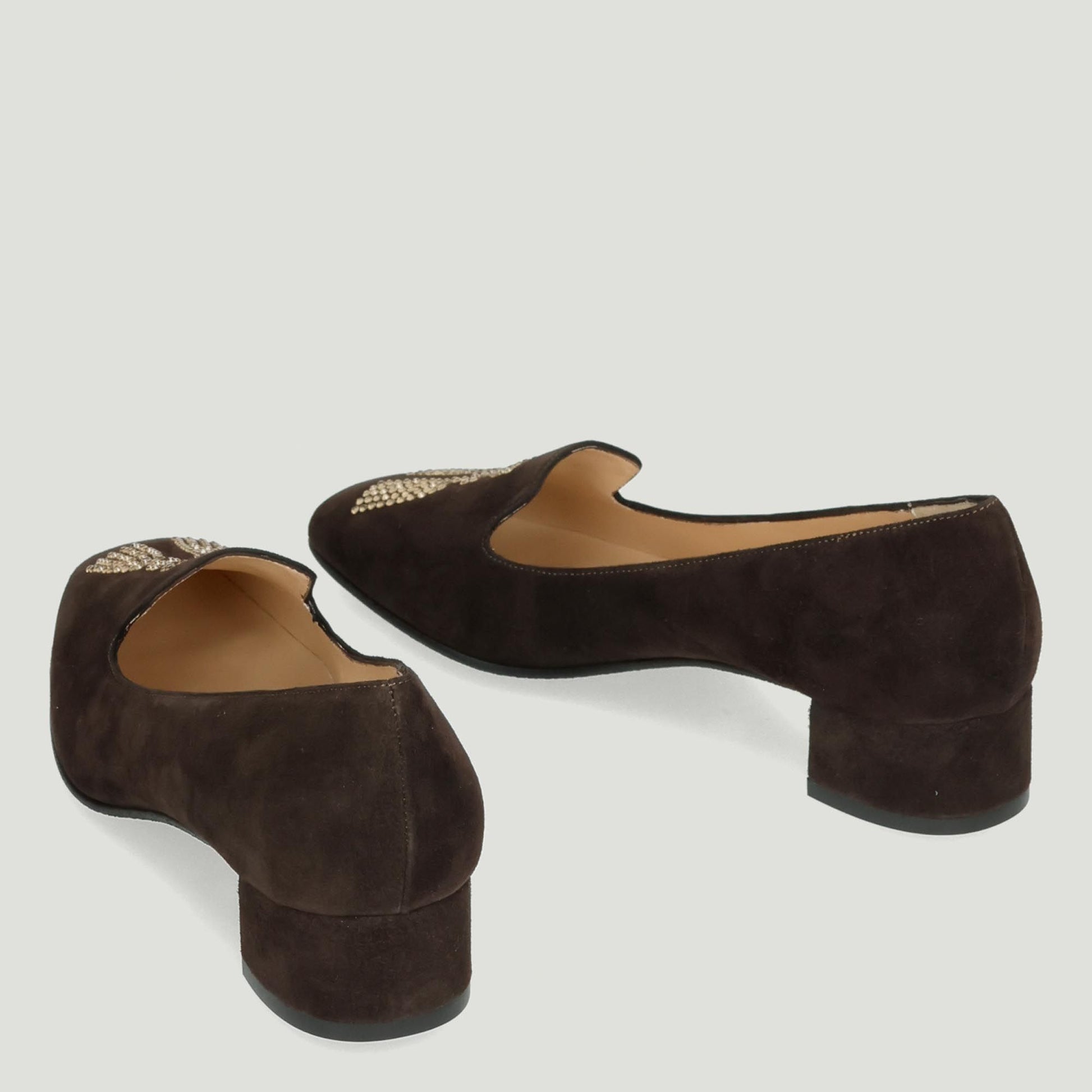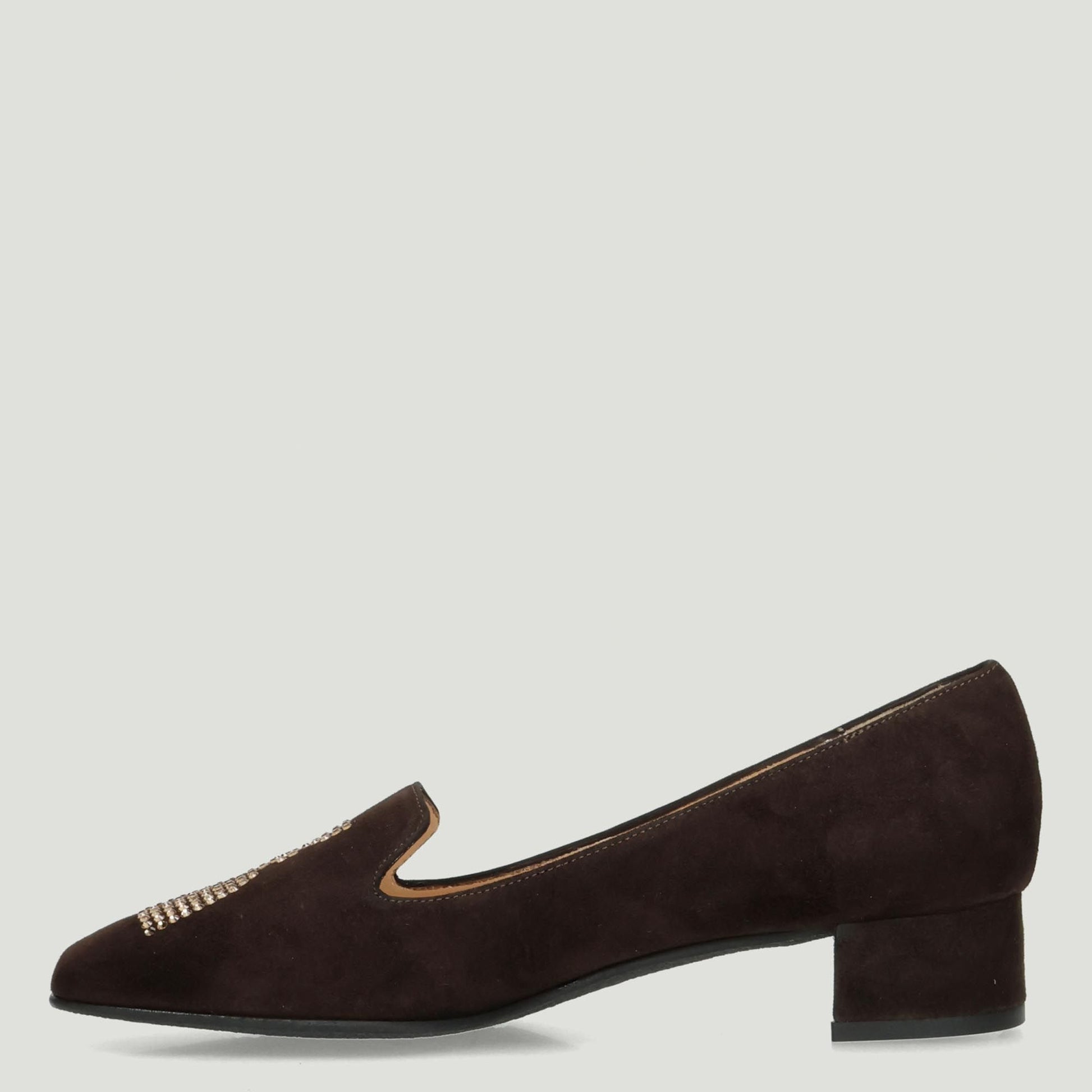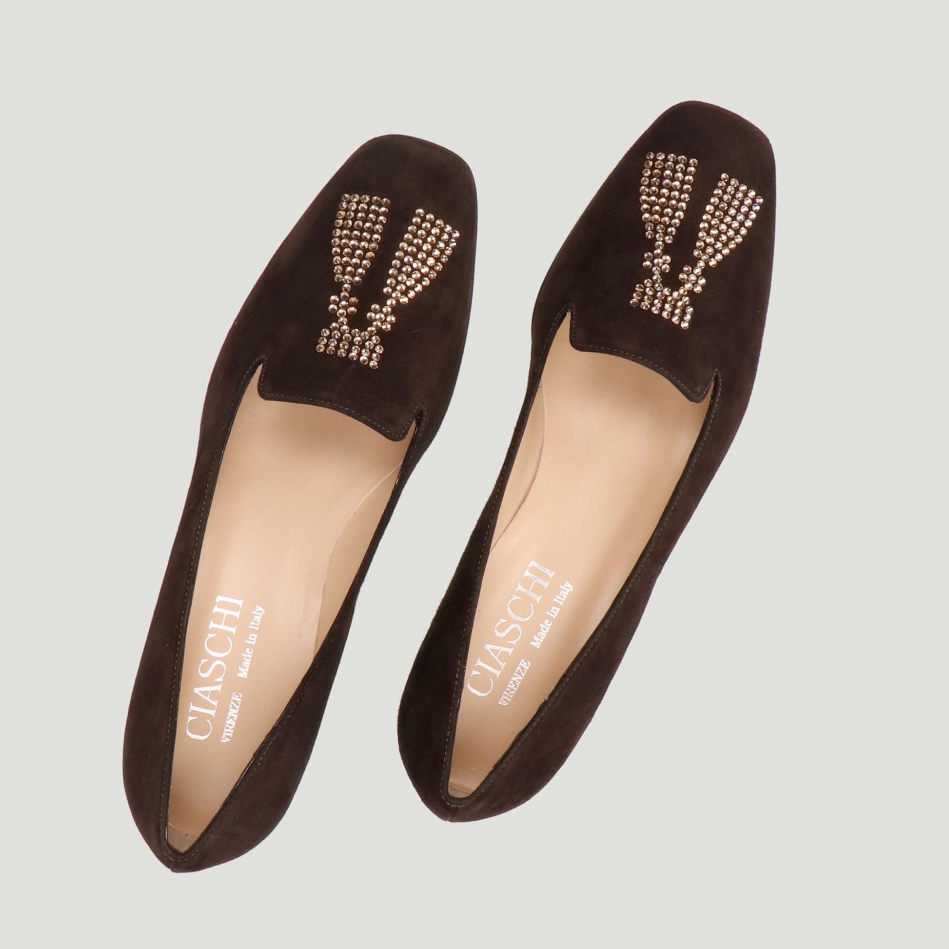 Dark brown suede slippers with faux rhinestone tassel. Square toe. Leather lining. Rubber sole with 3 cm heel. Ciaschi Firenze women's Fall/Winter collection.