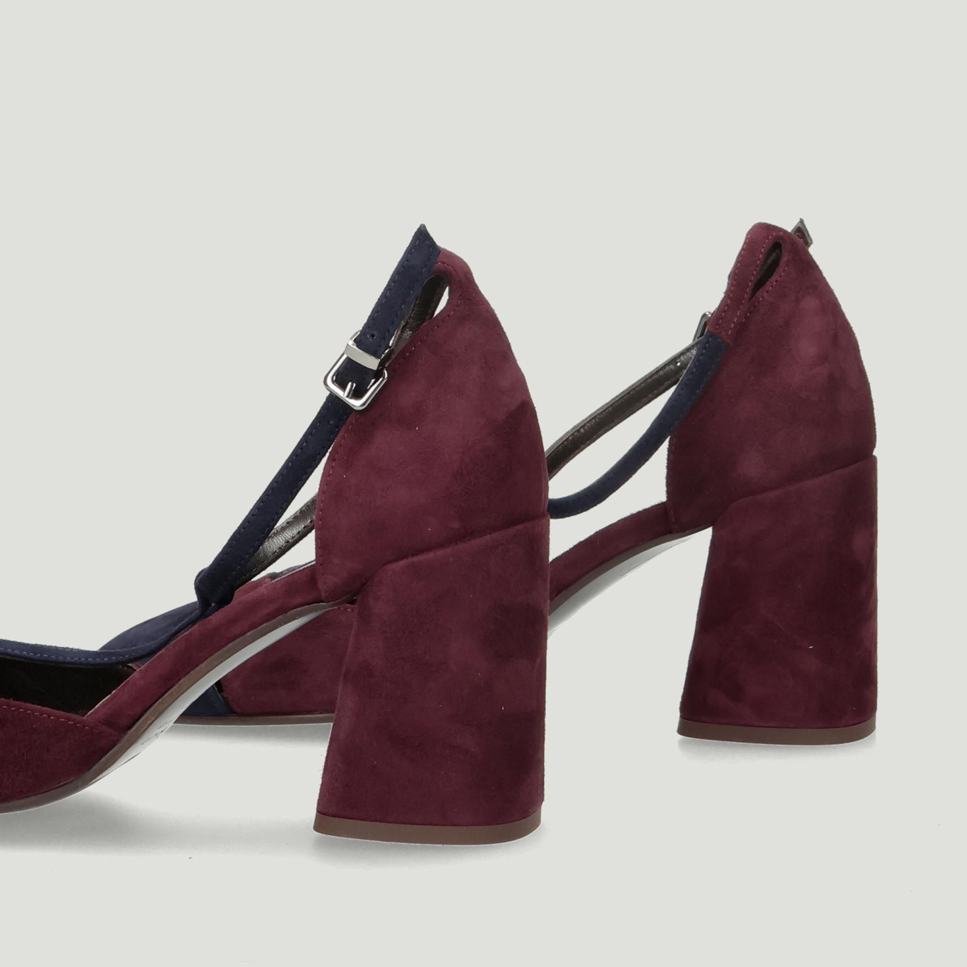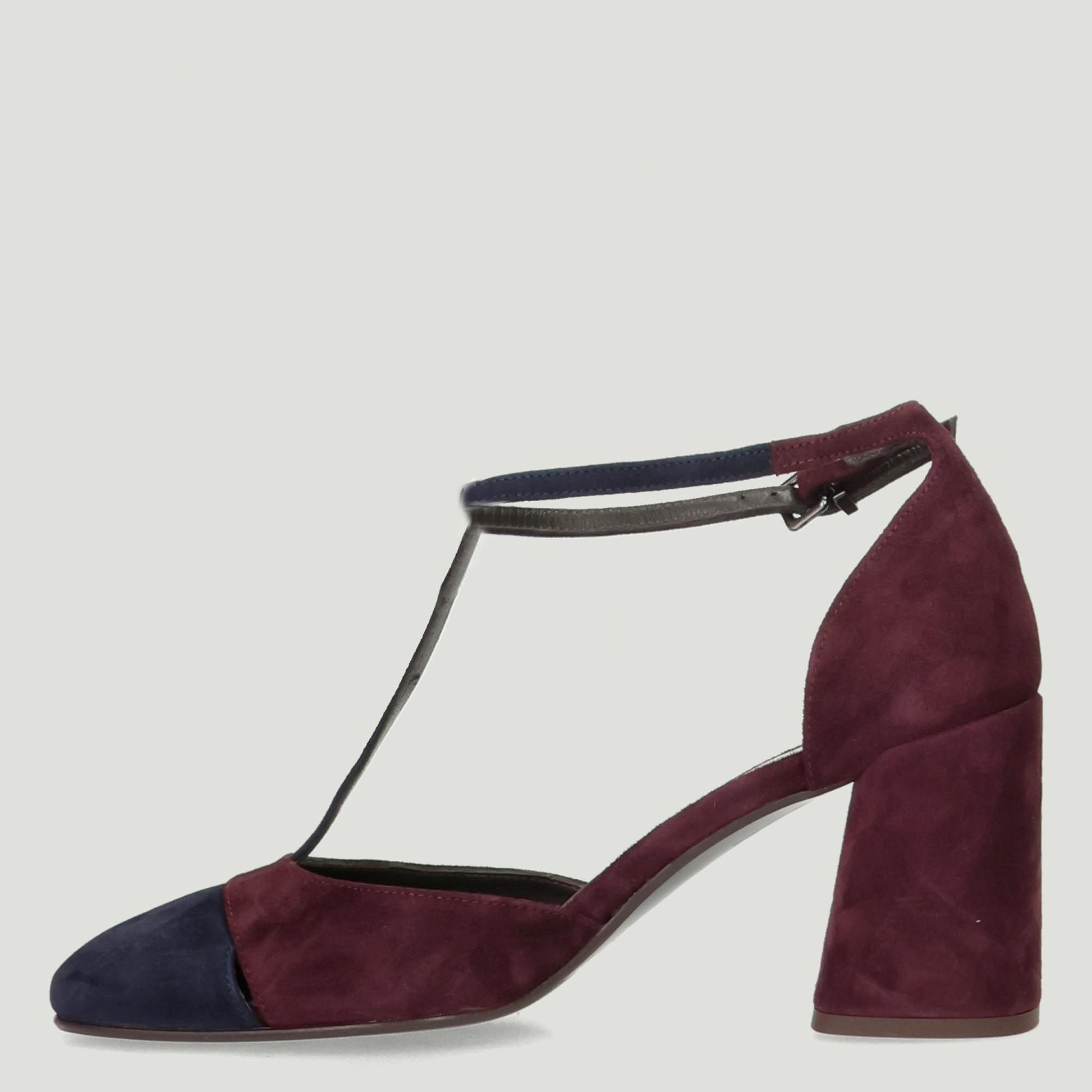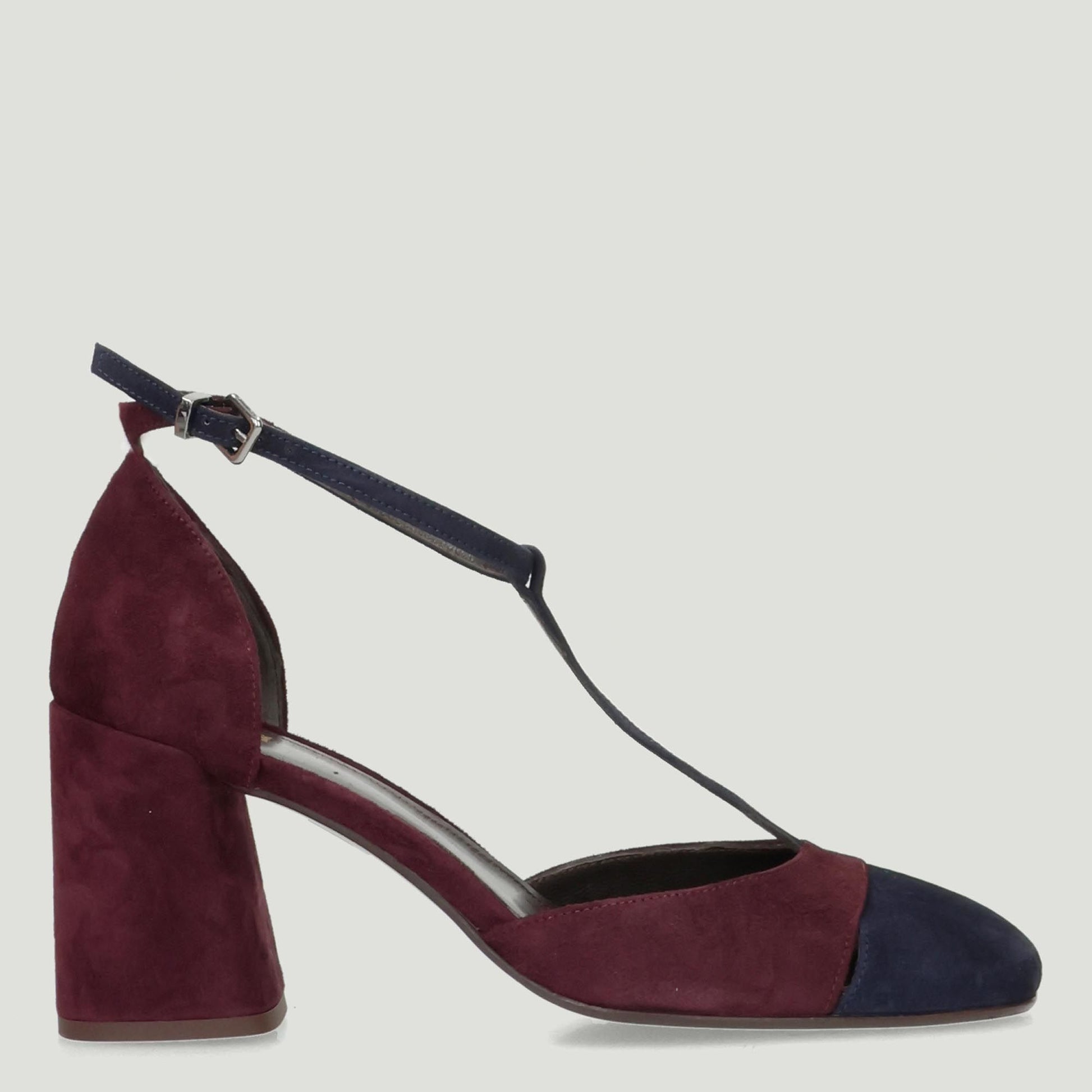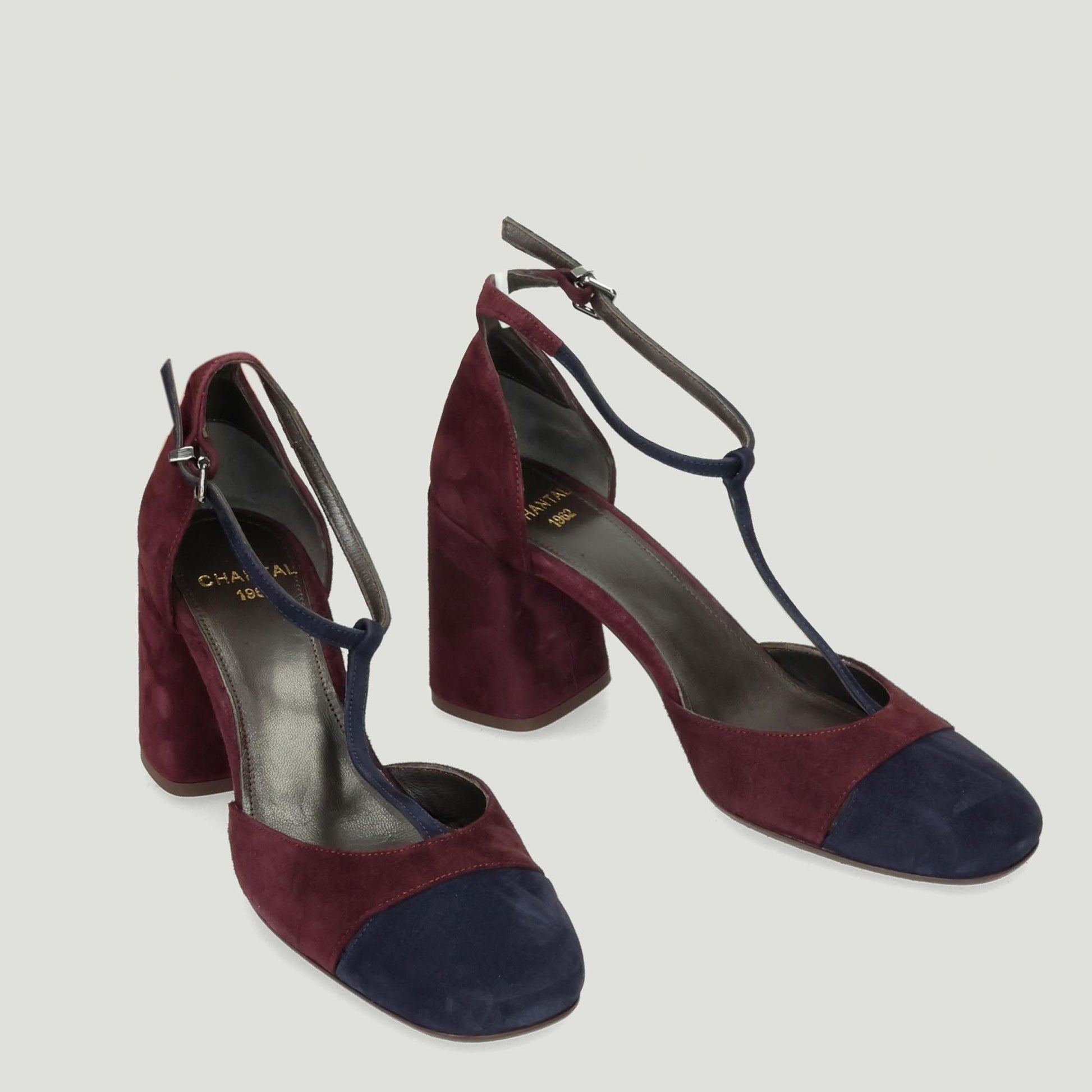 Burgundy suede Charleston pumps with blue suede toecap and strap. Square shape. Leather lining. Leather and rubber sole with 7 cm heel. Chantal Fall/Winter collection.