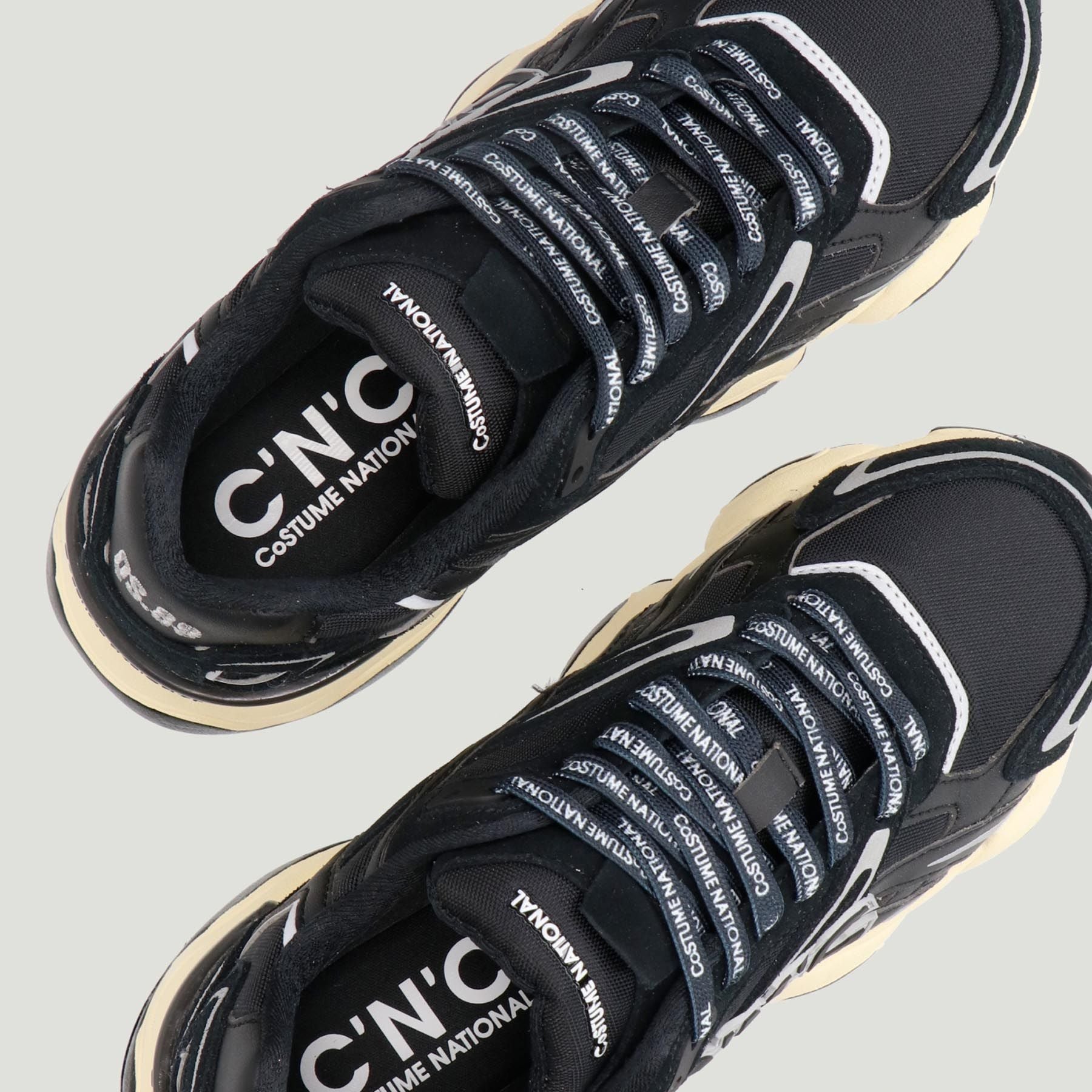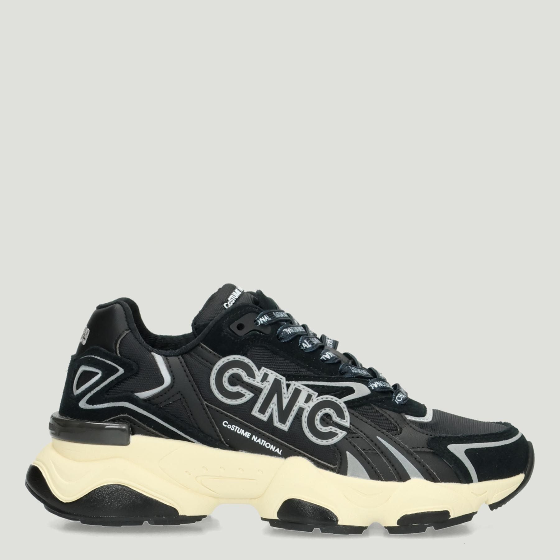 Sneakers with black nylon upper and black suede inserts. Lace-up closure with lettering. Logo tongue. Fabric lining with removable insole. 4 cm rubber sole. C'N'C Costume National women's collection.