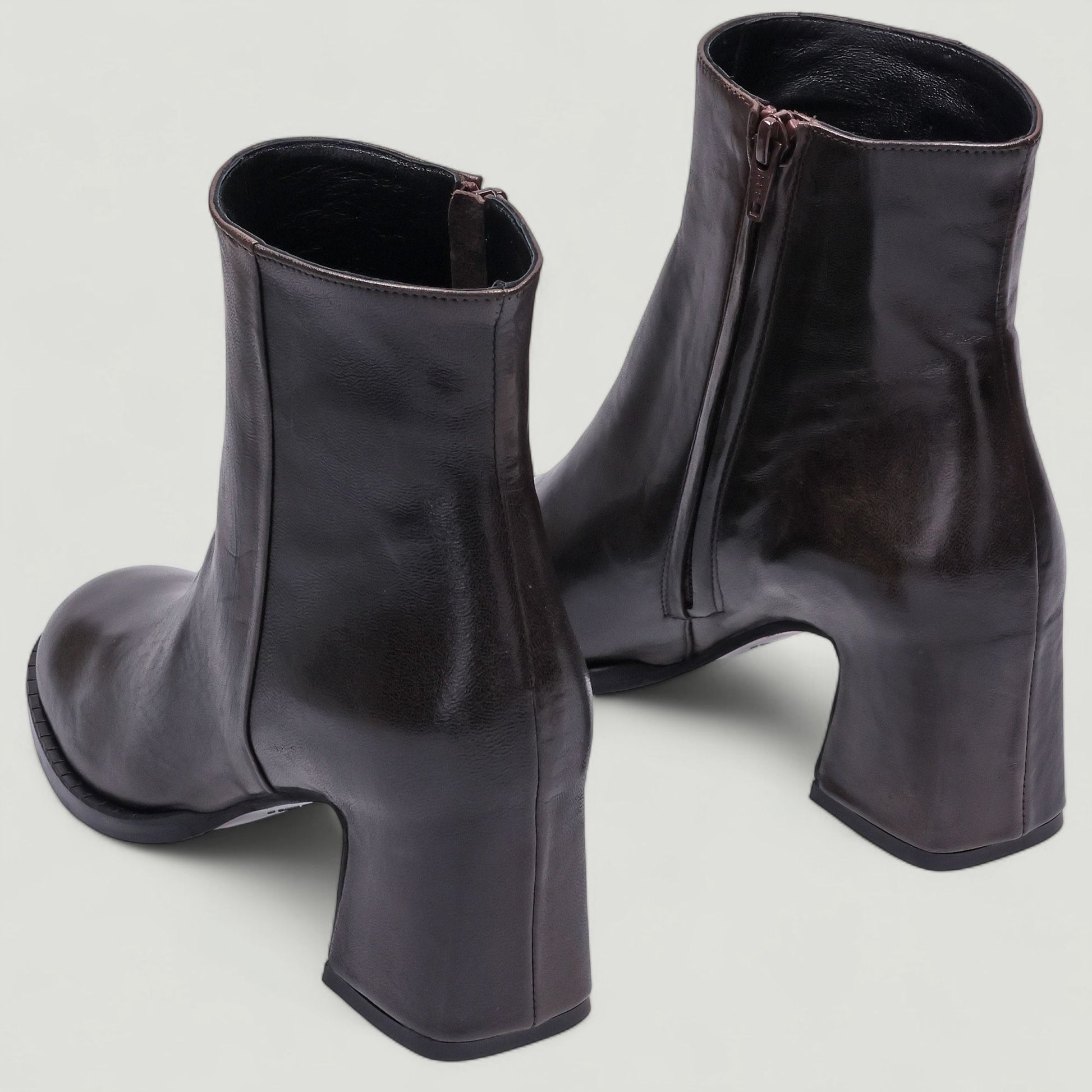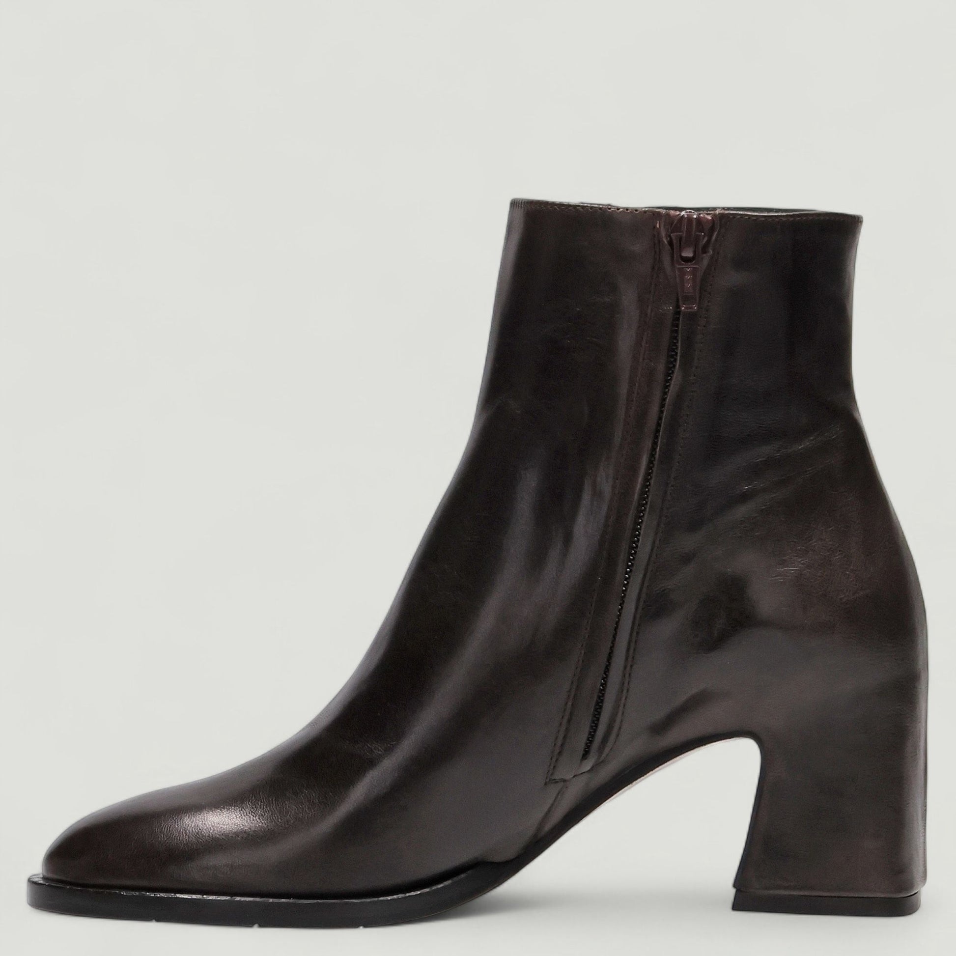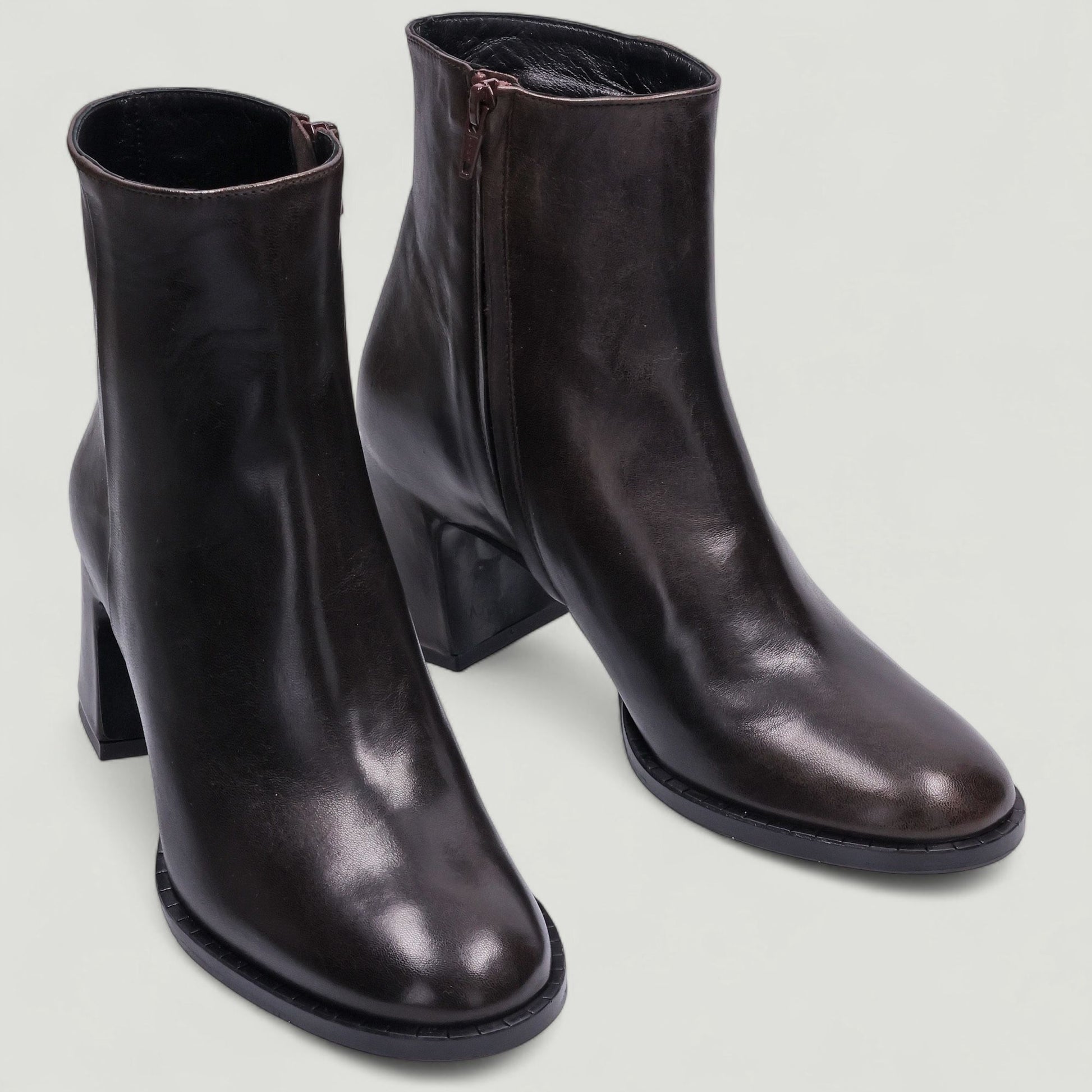 Dark brown leather ankle boot with internal zip. Leather lining. Rubber sole with 6 cm heel. Silvia Rossini Fall/Winter collection.