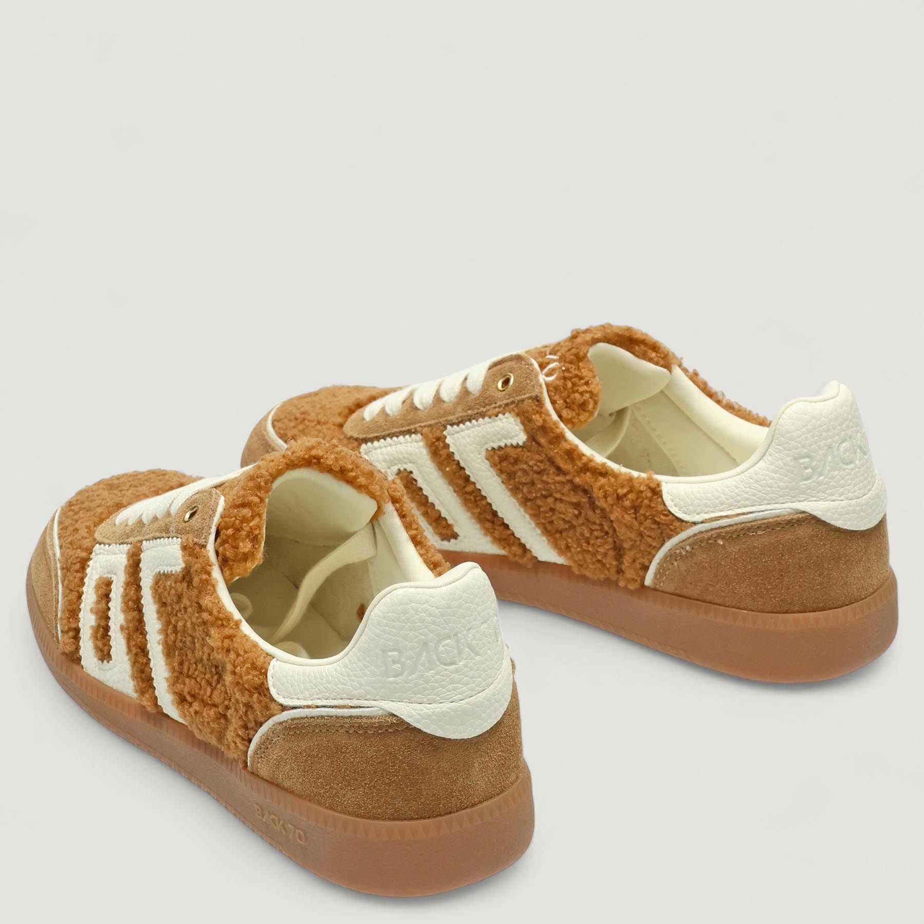 Leather and curly wool-effect fabric sneakers in tan. Ivory leather side logo. Fabric lining with removable insole. Putty-colored rubber sole. Back 70 women's fall/winter collection.