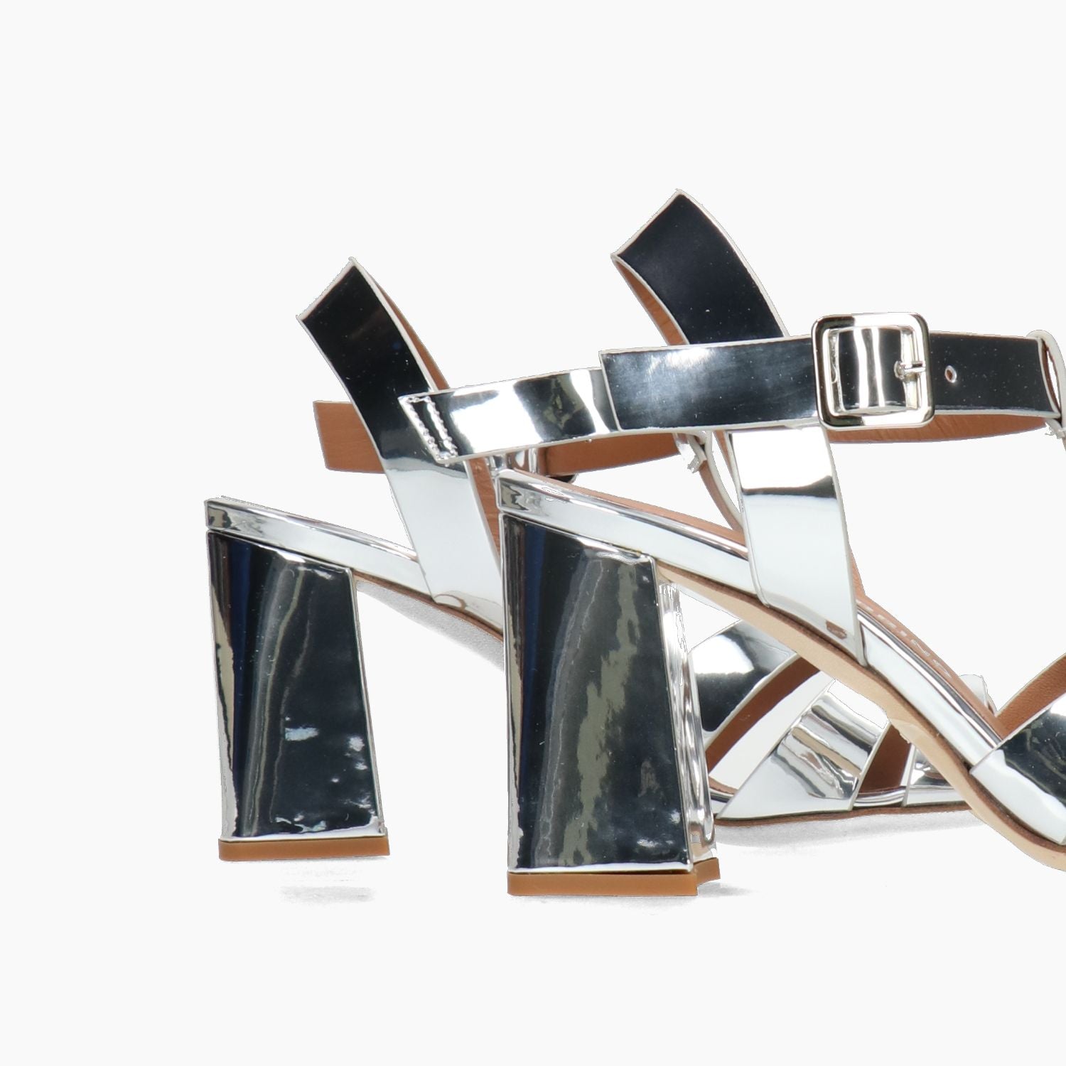 Silver mirrored laminated leather sandal with adjustable ankle strap. Leather lining. Leather sole with 8 cm heel. Chiara Carrino Spring/Summer Collection.