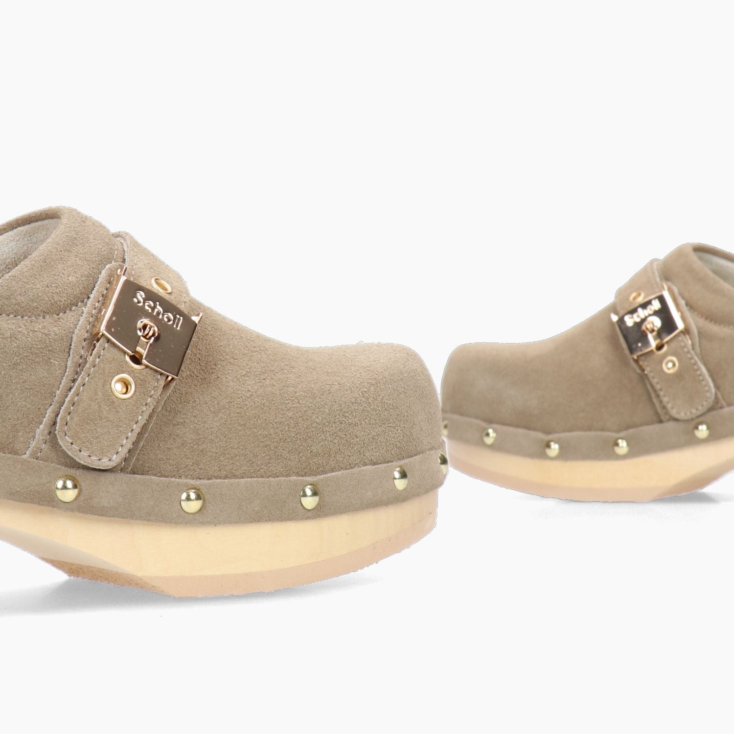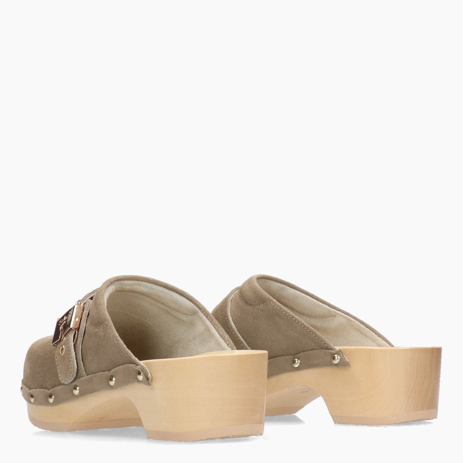 Beige suede wooden clog. Adjustable with a gold buckle. Anatomical insole. Rubber sole with a 5 cm heel. Women's Sholl collection.