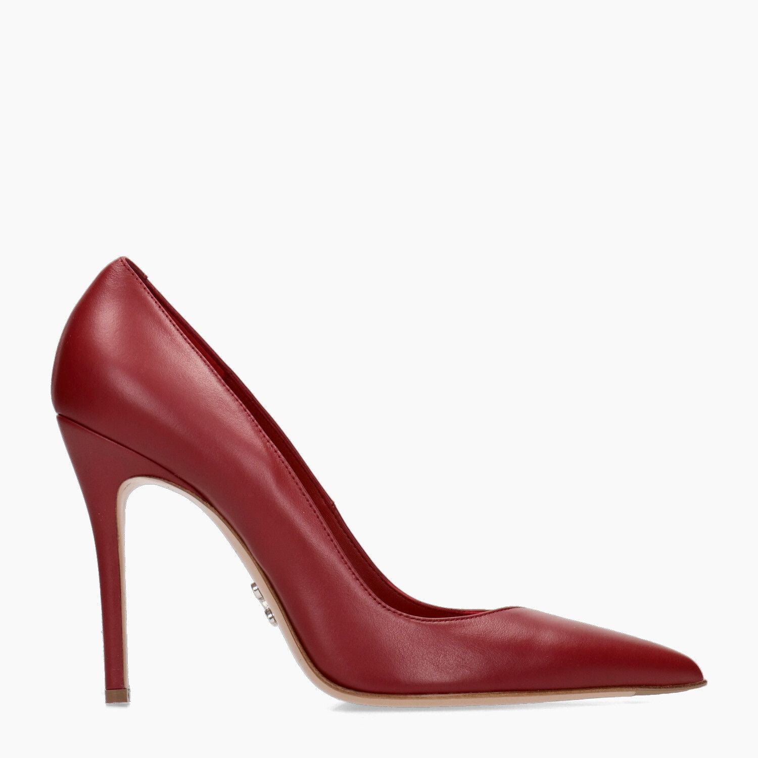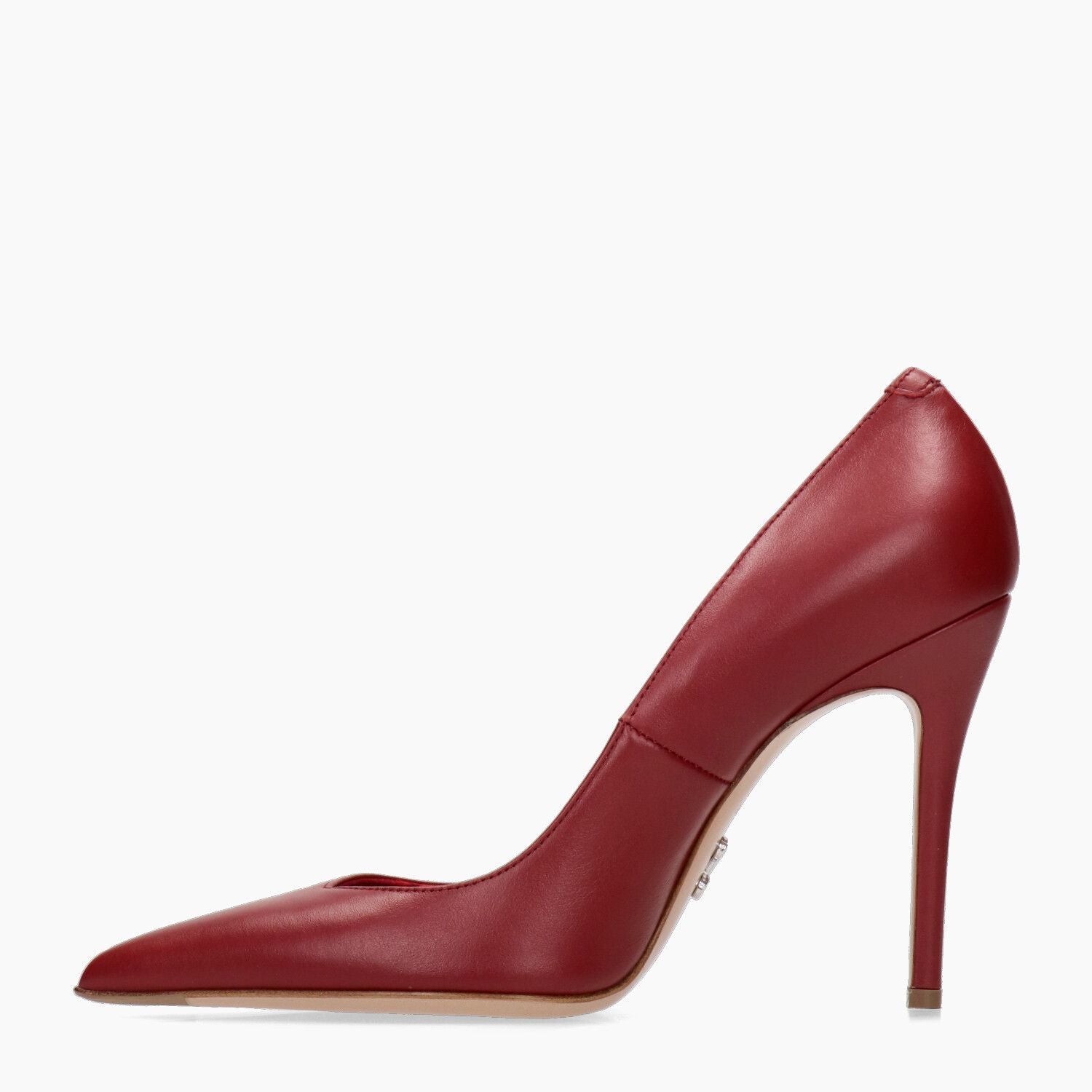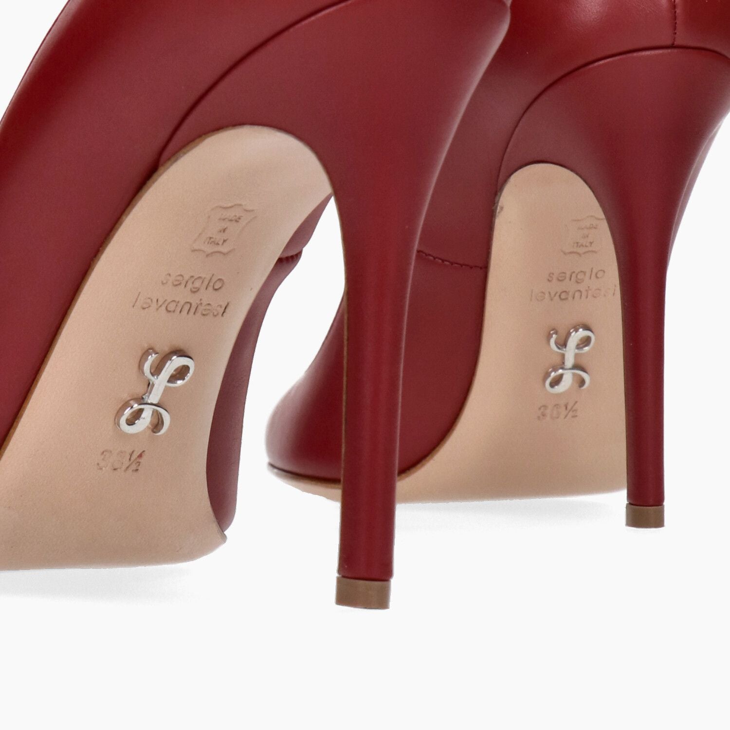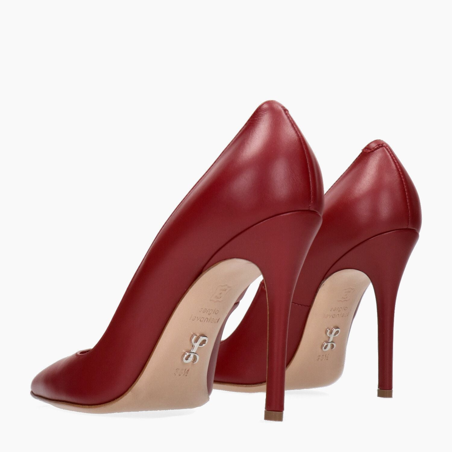 Cherry-colored leather pumps with asymmetrical neckline. Leather lining. Leather sole with metal logo. 10 cm heel. Sergio Levantesi Fall/Winter collection.