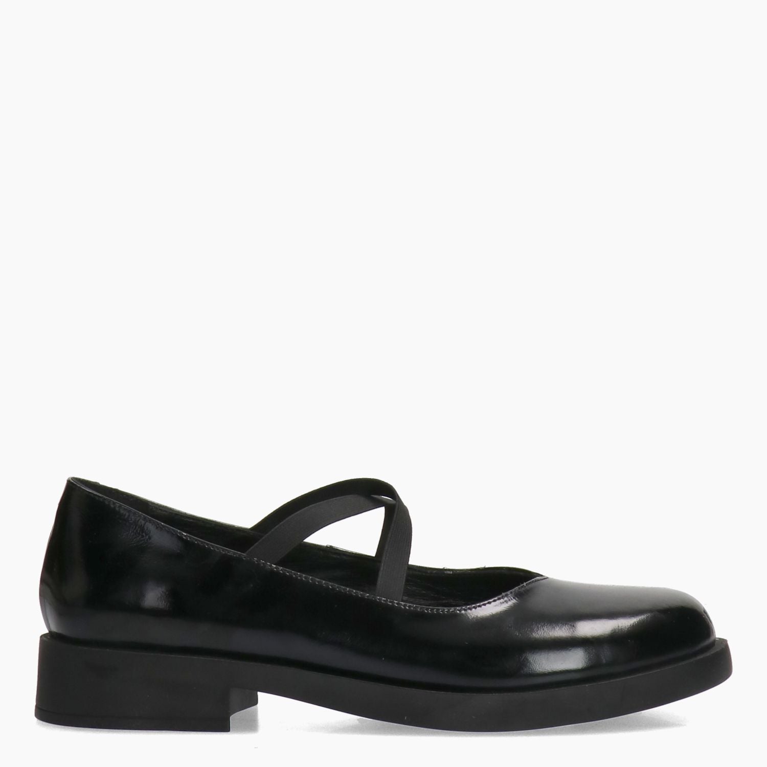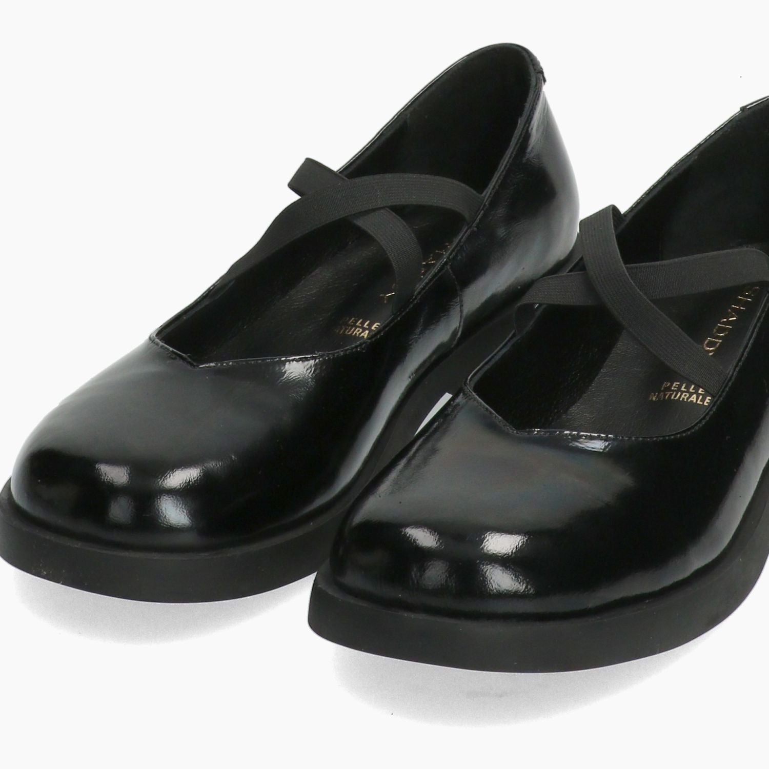 Black patent leather ballerina flats. Black elastic strap. Leather lining. Rubber sole with 3 cm heel. Shaddy women's fall/winter collection.