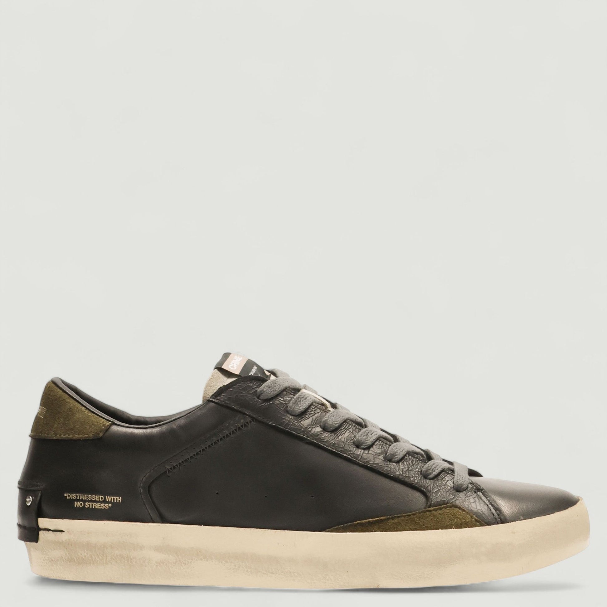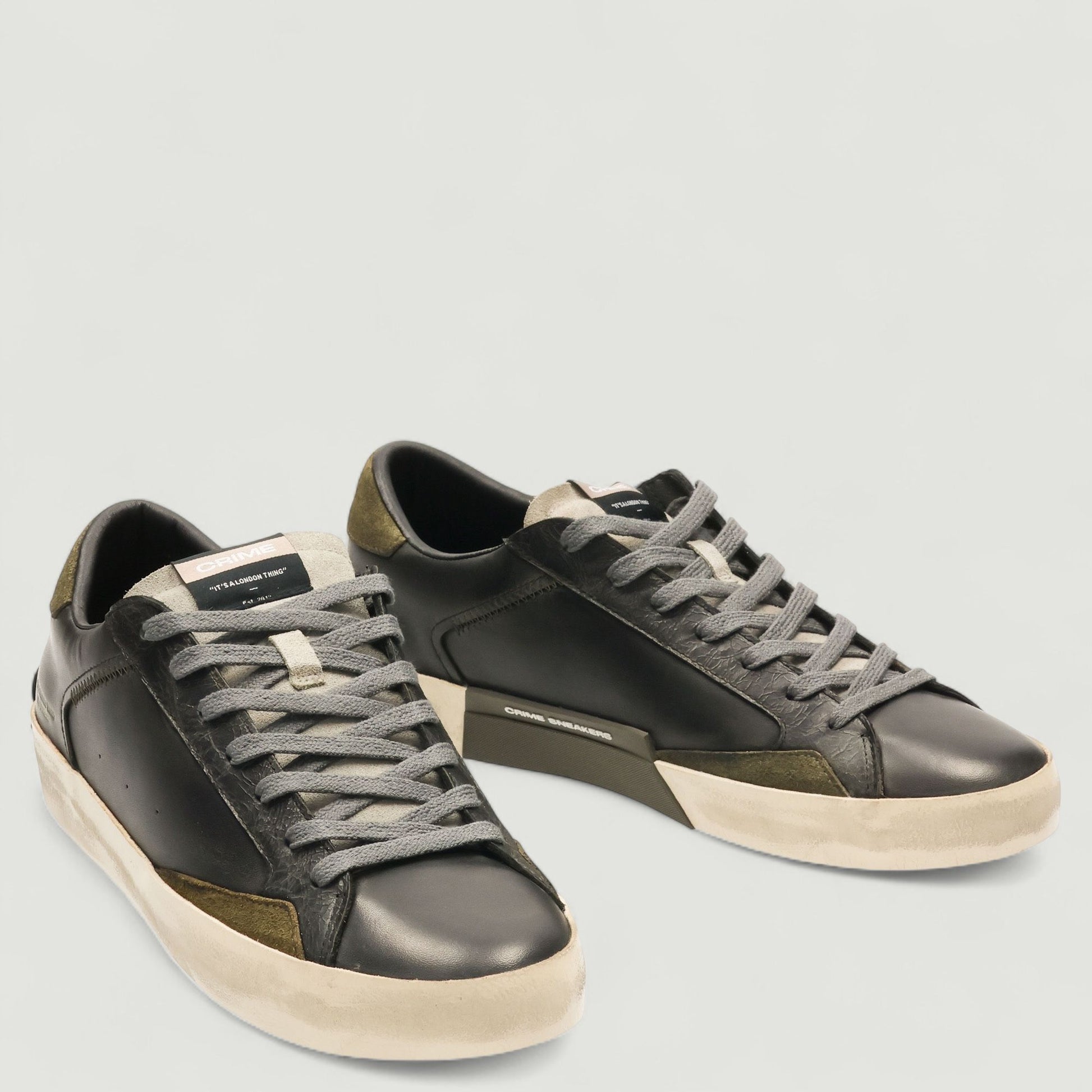 Sneakers with distressed gray leather upper and military green suede inserts. Gray cotton laces. Logo tongue. Logo heel tab. Fabric lining with removable leather insole. Rubber sole. Crime London men's collection.