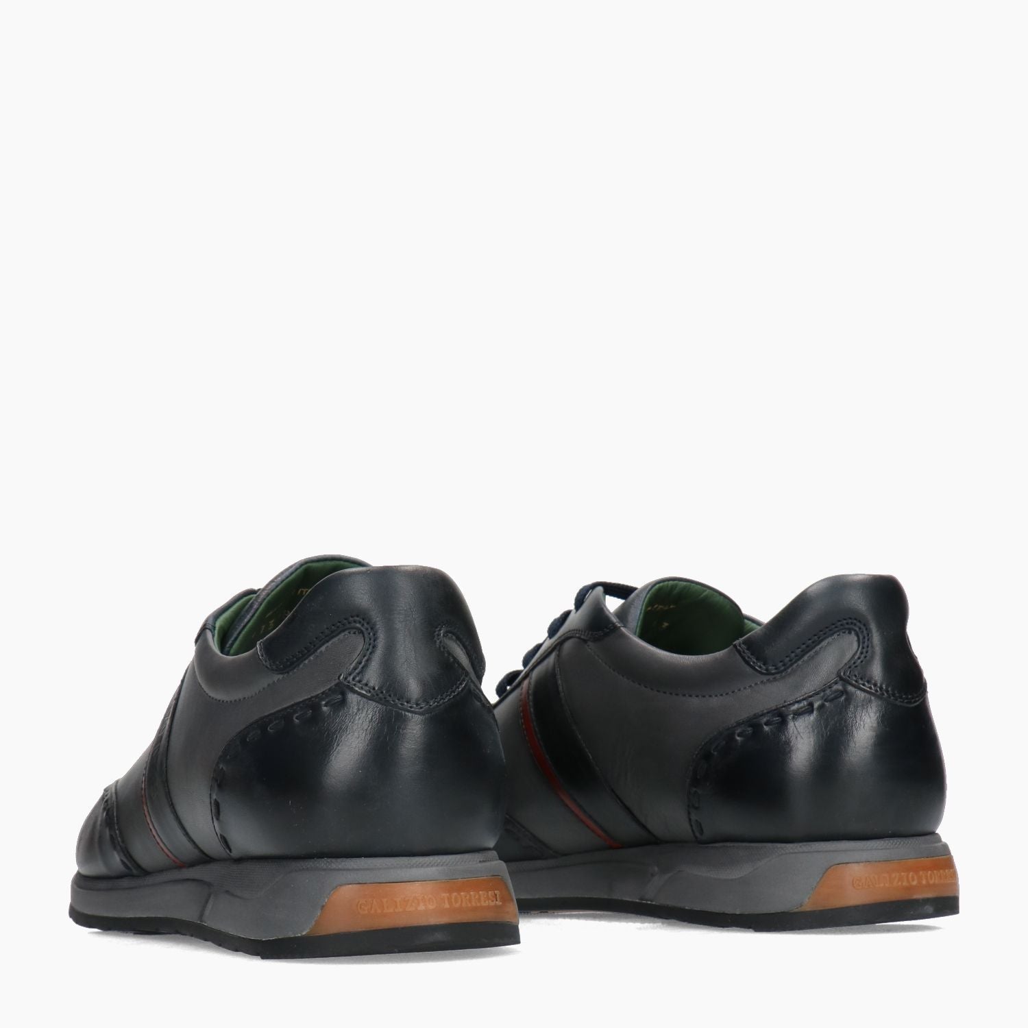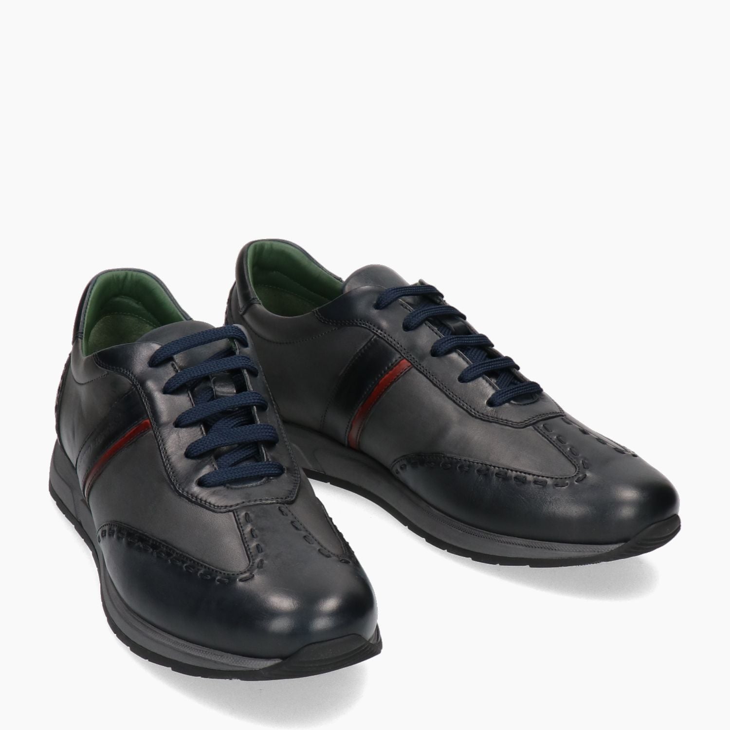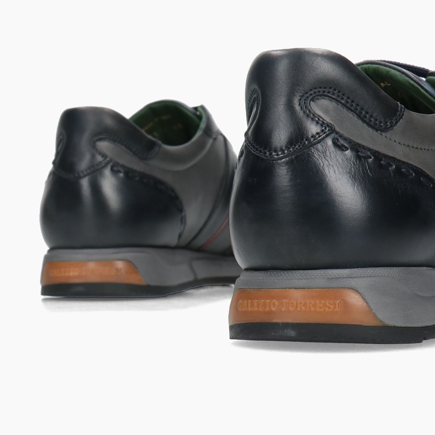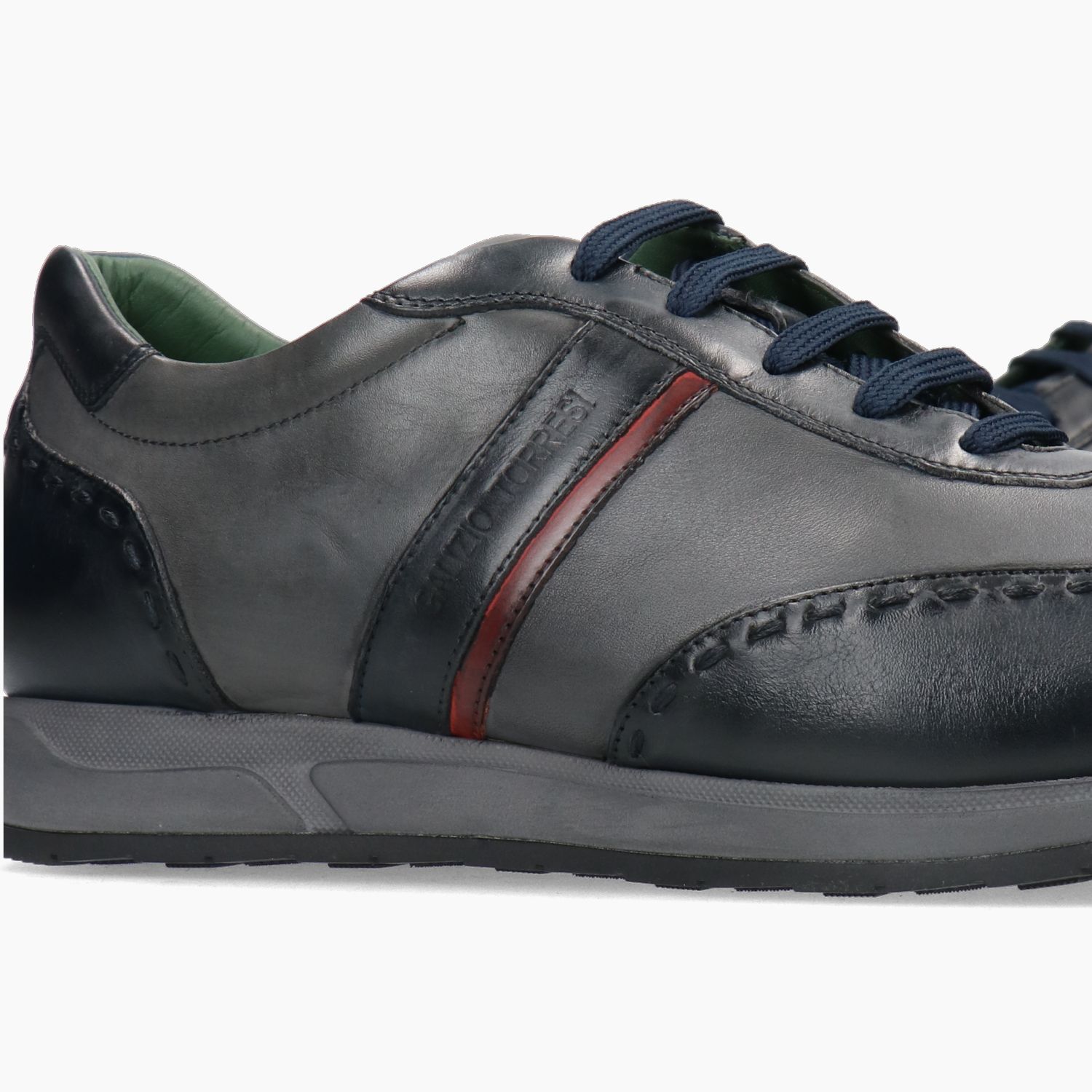 Gray and dark blue leather sneakers with side logo. Blue lace-up closure. Leather lining. Removable leather insole. Rubber sole with back logo. Galizio Torresi men's Fall/Winter collection.