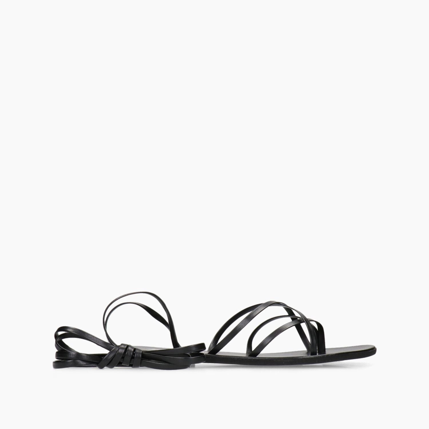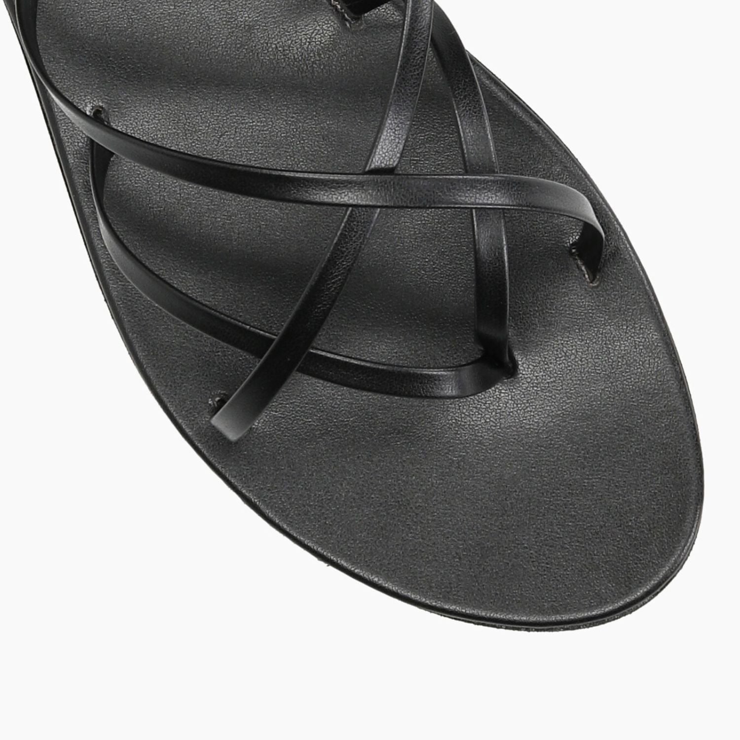 Black leather sandals with gladiator strap, 10 cm heel, rubber sole.