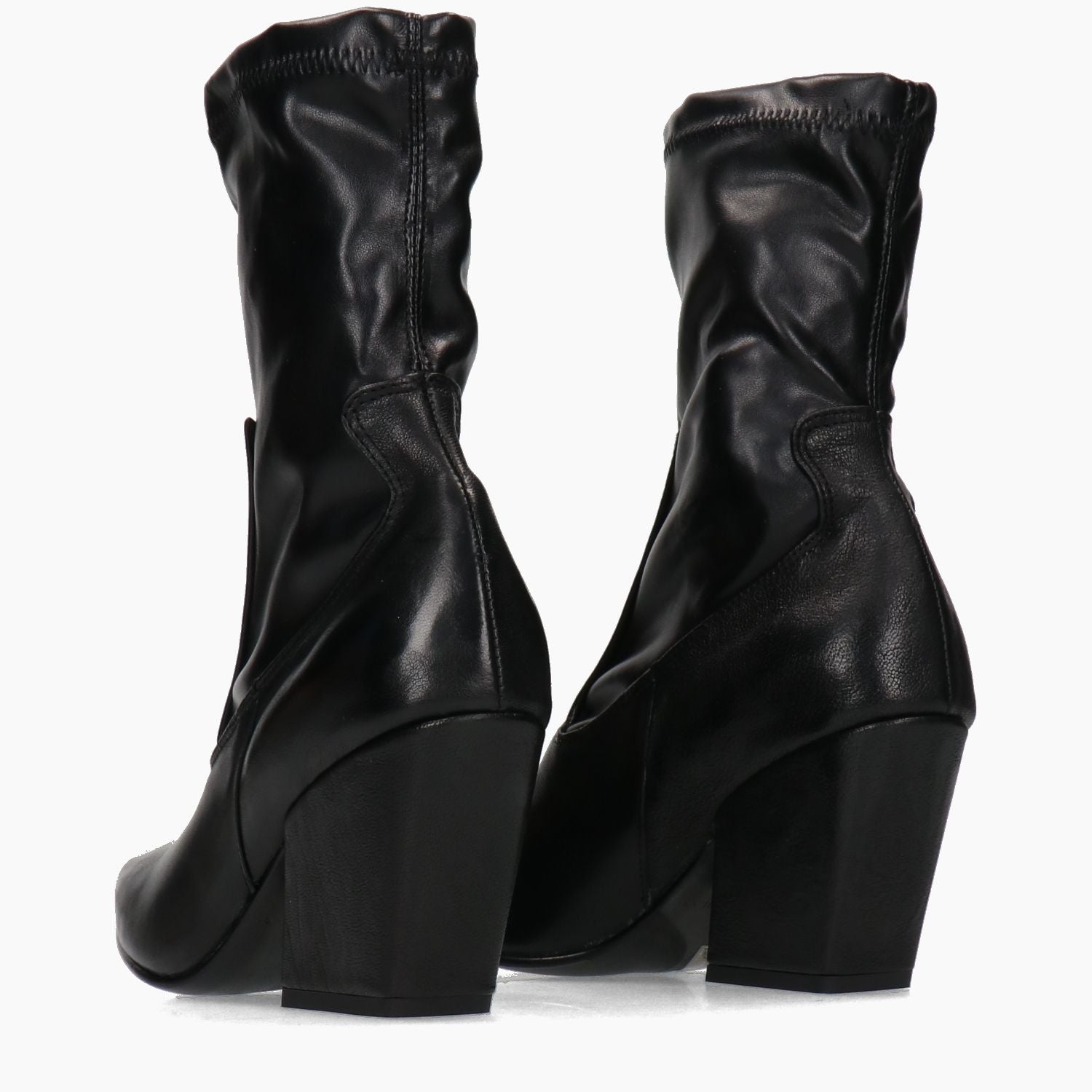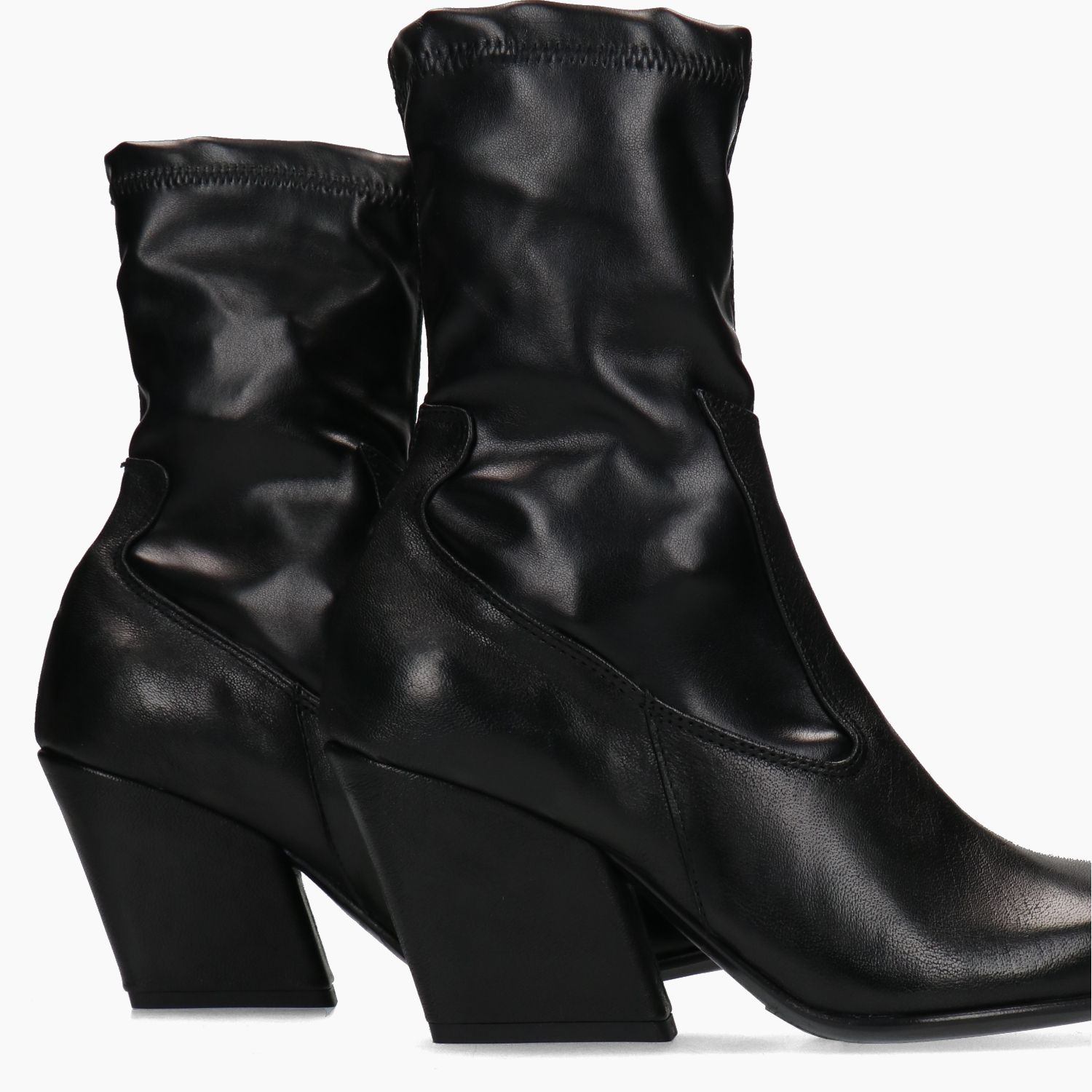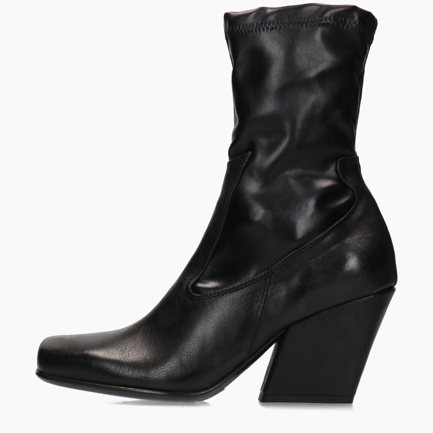 Leather ankle boot with elasticated black faux leather upper. Leather-lined foot. Leather and rubber sole with a 6 cm block heel. Ernesto Dolani women's Fall/Winter collection.