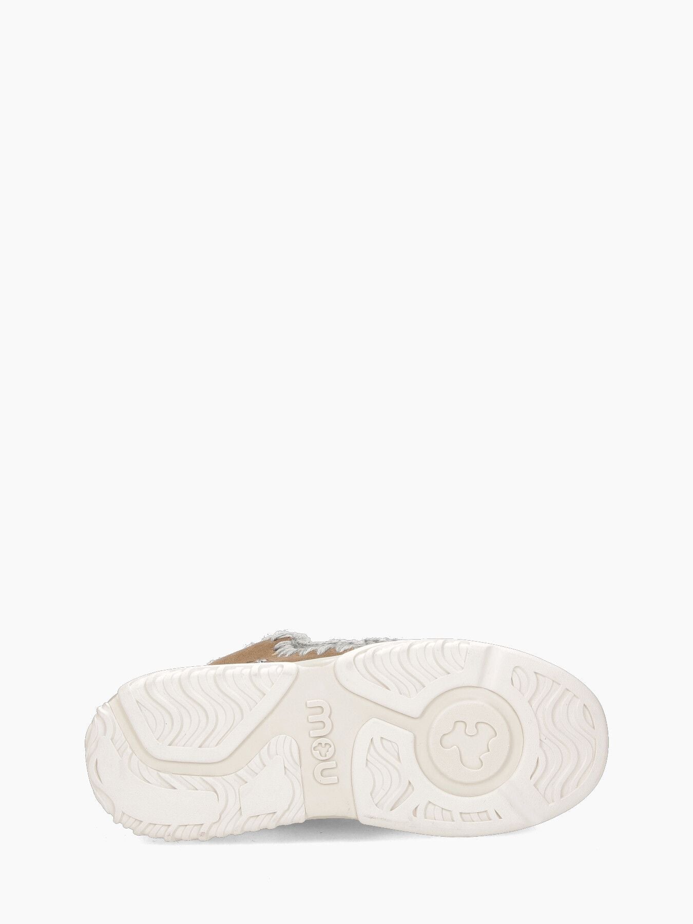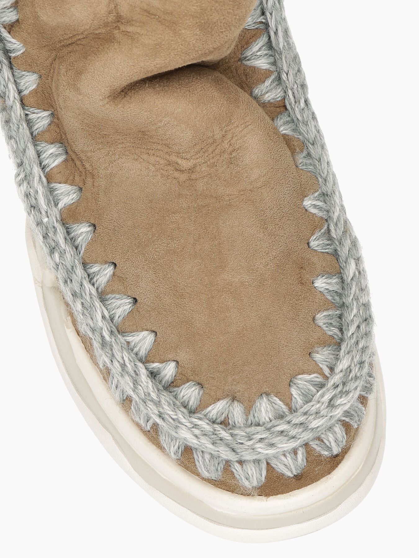 Light brown sheepskin ankle boots, grey melange wool stitching, gold metal chain on the heel, rubber running sole.