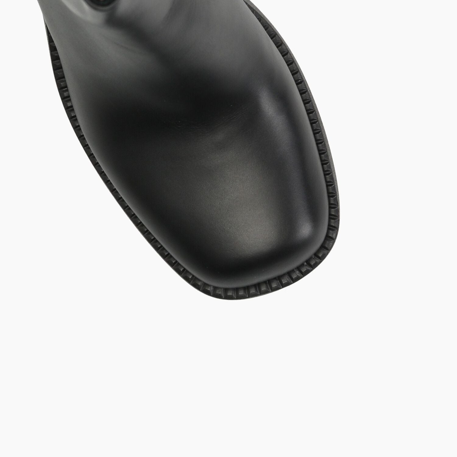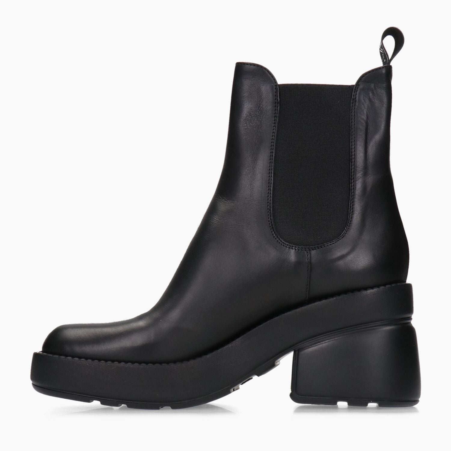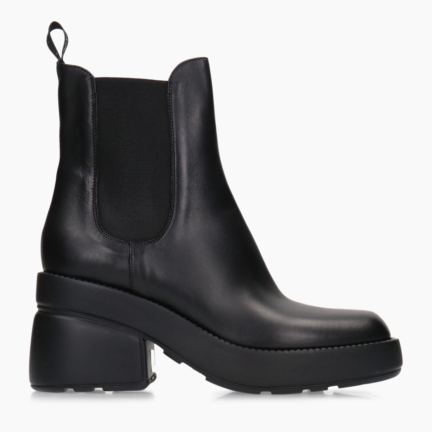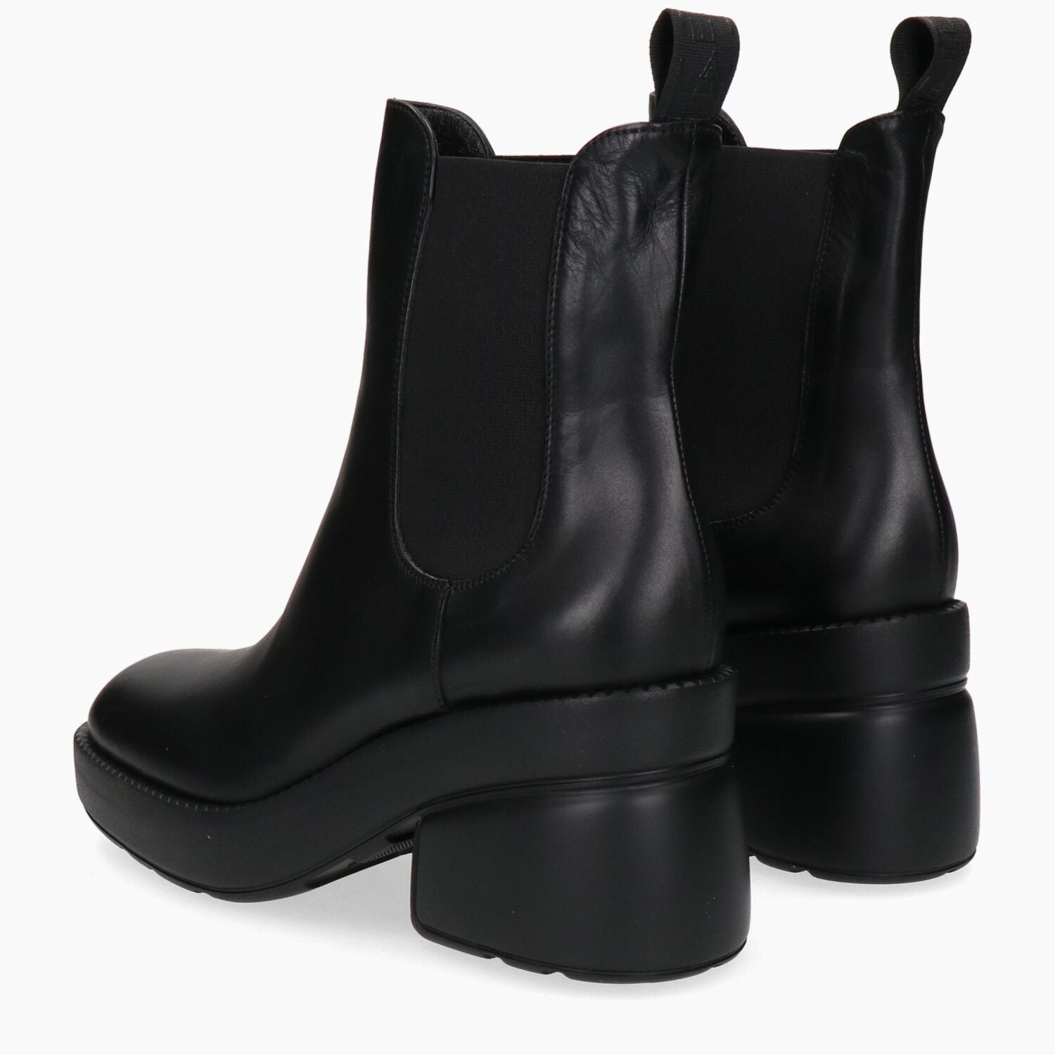 Black leather ankle boots with elastic sides and rubber sole.