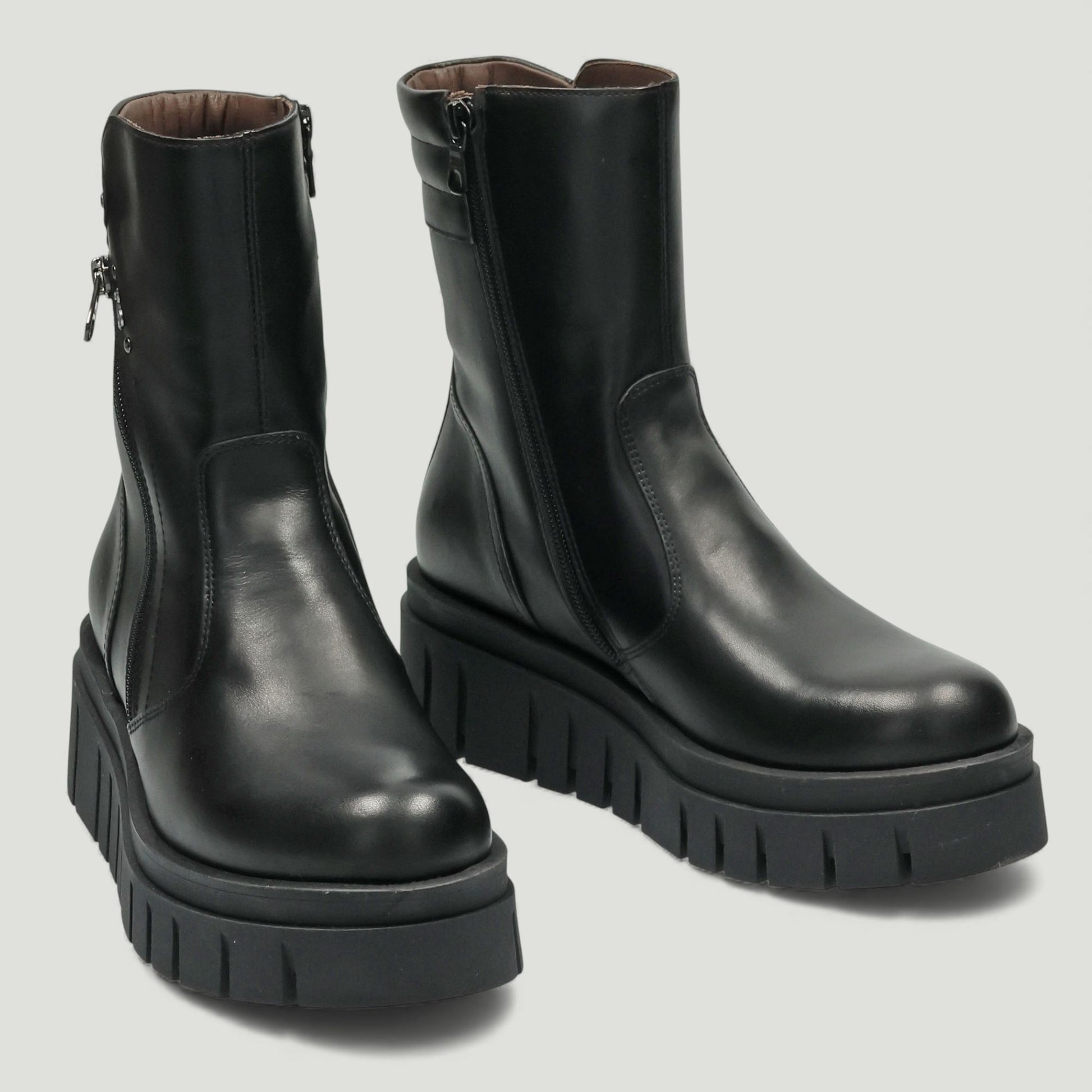 Black leather ankle boot. Internal zip closure with faux zip on the outer shaft. Leather lining. Rubber sole with 5 cm wedge. Women's Nero Giardini collection.