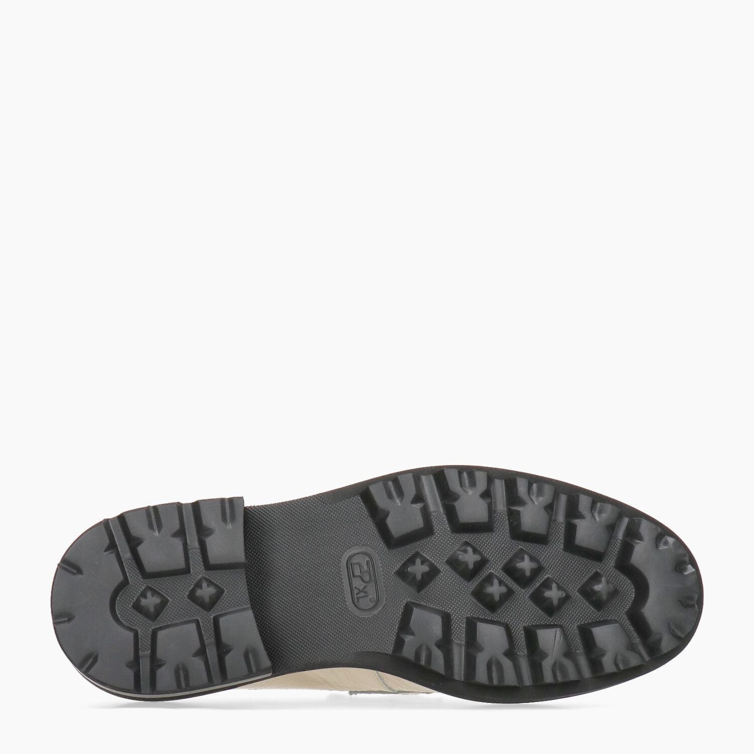 Beige patent leather loafers with gold metal accessory, rubber sole.
