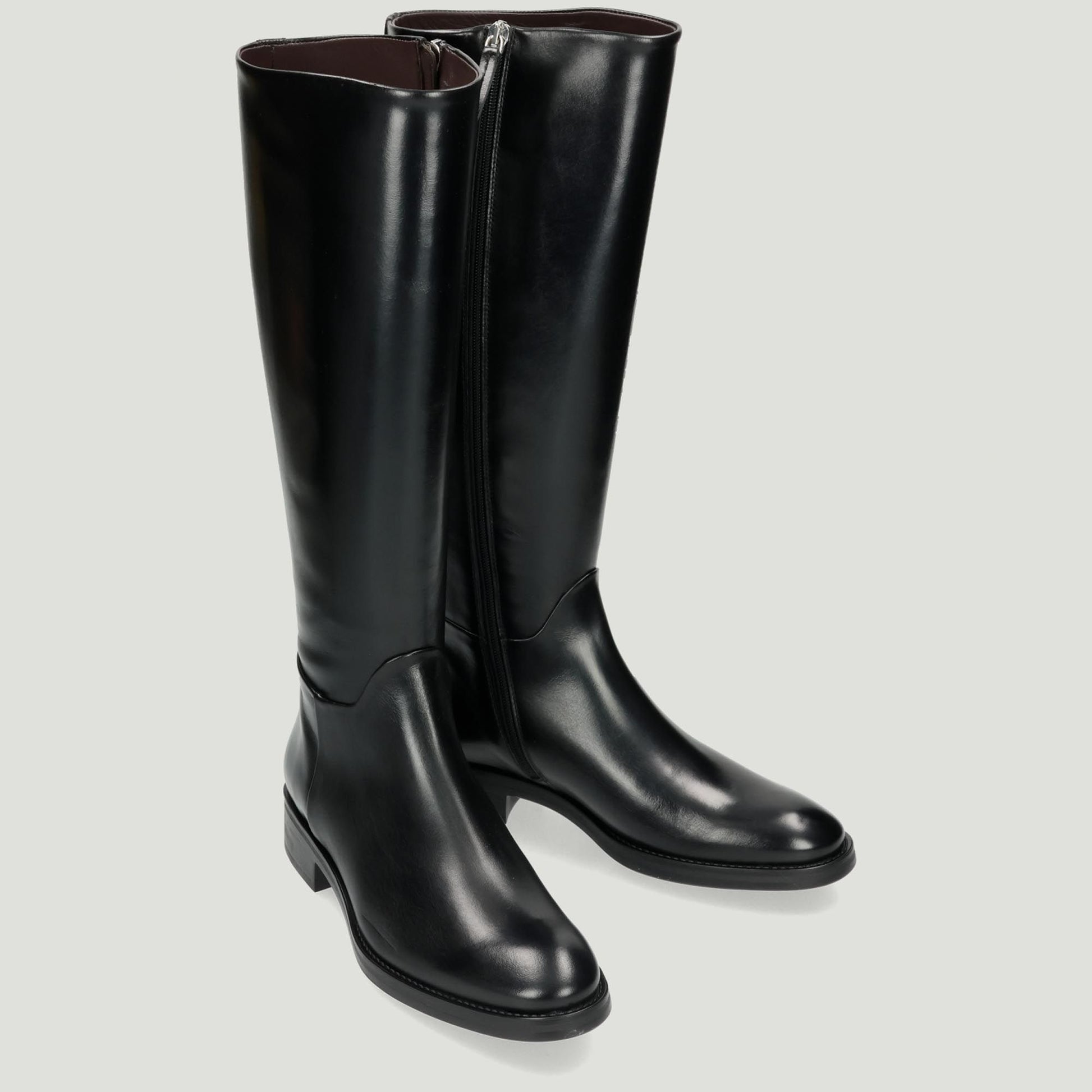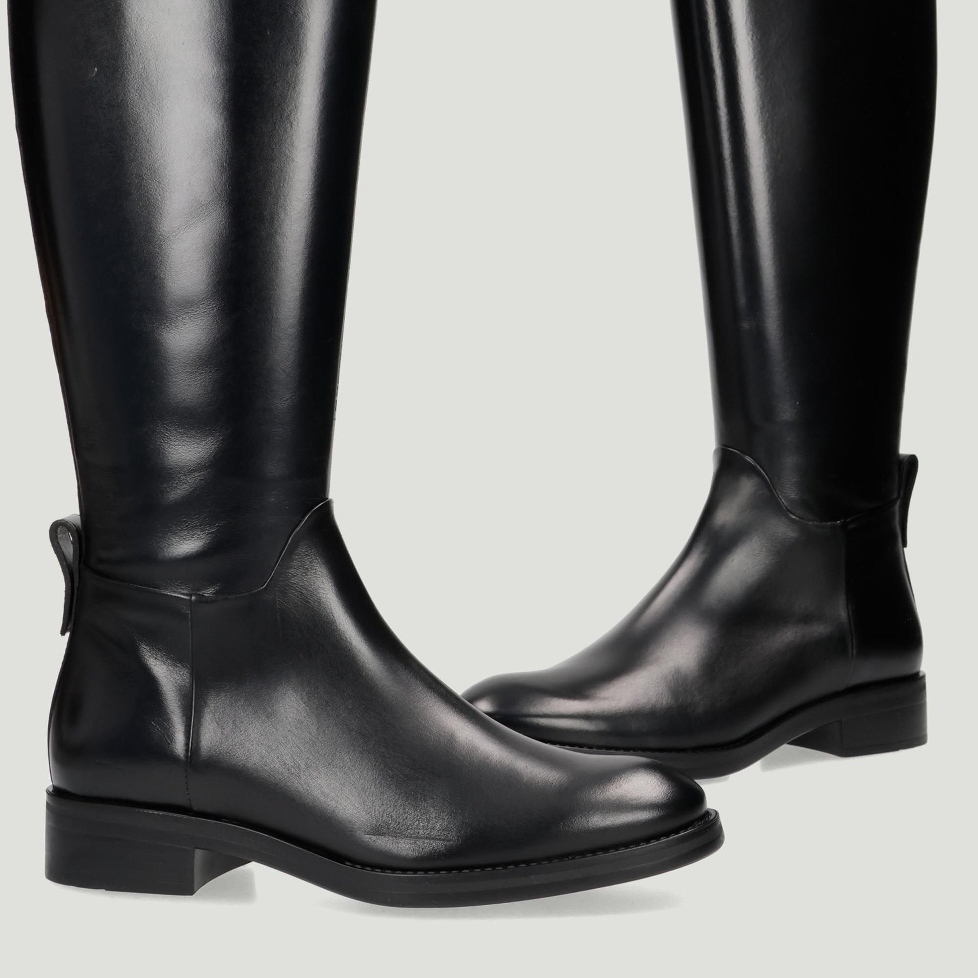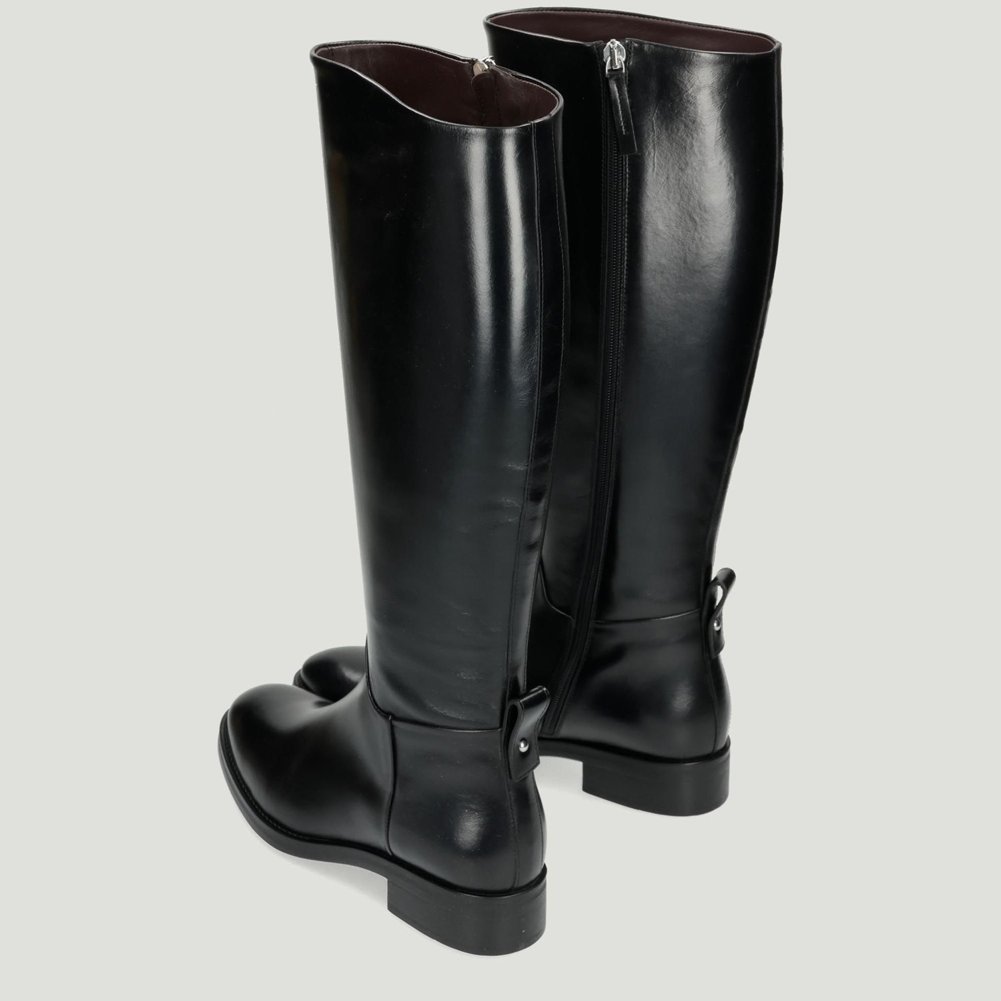 Black leather knight boot with a loop at the back. Leather lining with a non-removable insole. Internal zip closure. Shaft height: 39 cm, measured from the inside of the heel (size 37). Rubber sole with a 3 cm heel. Triver Flight women's Fall/Winter collection.