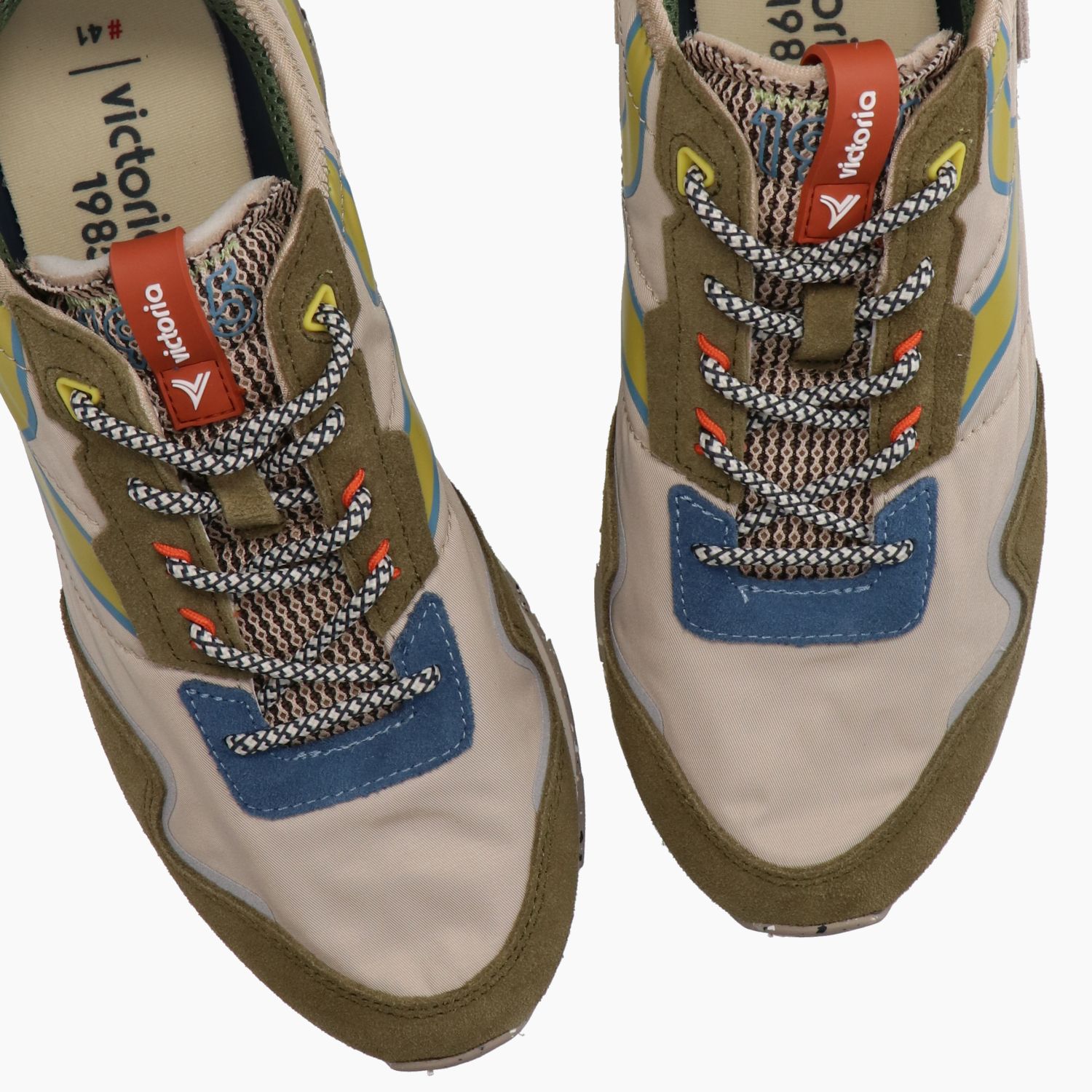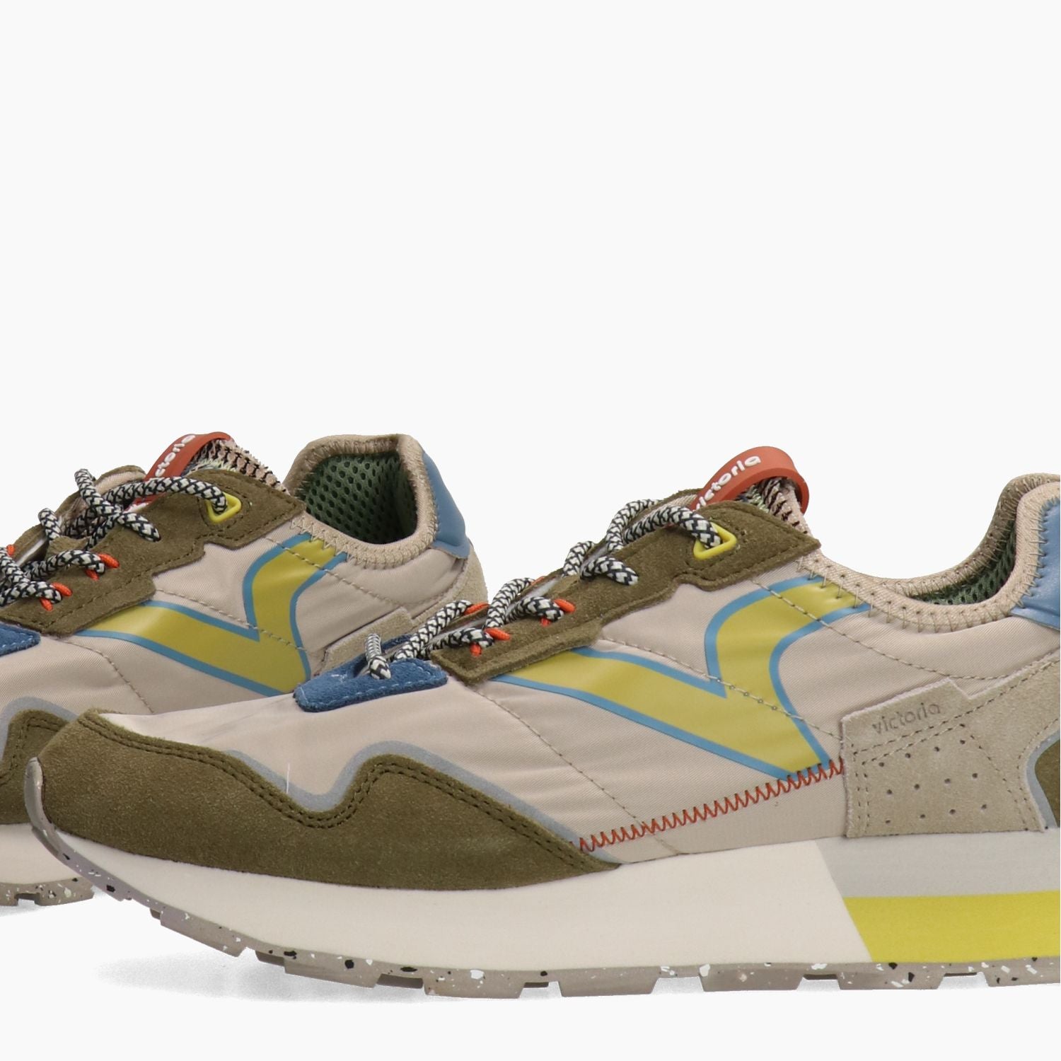 Sneakers with dove gray nylon uppers and military green suede inserts. Lace-up closure and spare ecru cotton laces. Logo tongue. Removable insole. 4 cm multicolored rubber sole. Men's Victoria collection.