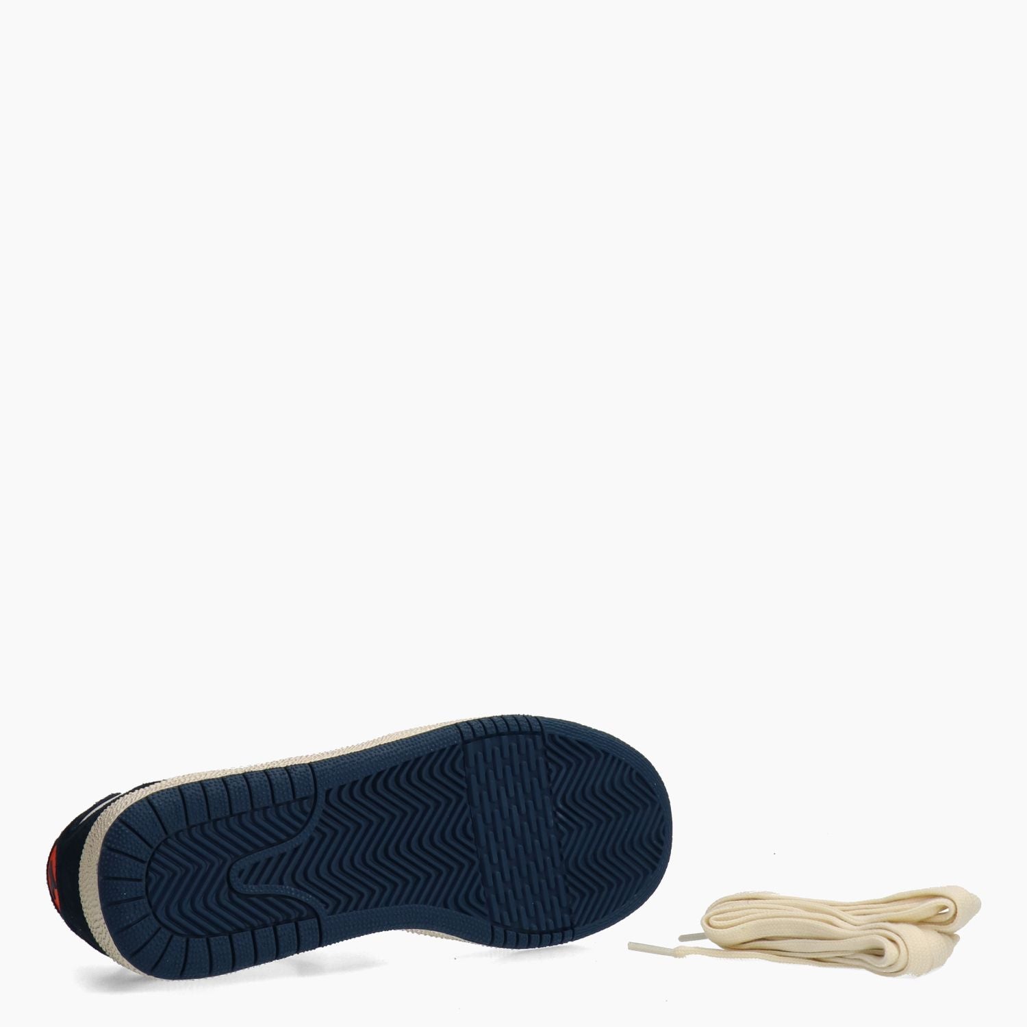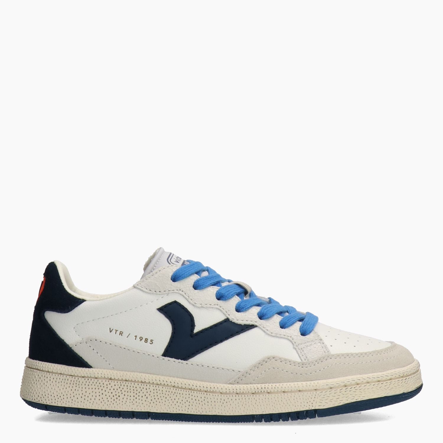 Sneakers with white leather upper. Ice suede trim and green suede heel. Blue leather logo on the side. Yellow lace-up closure with an extra ecru cotton lace. Fabric lining. Rubber sole. Victoria men's collection.
