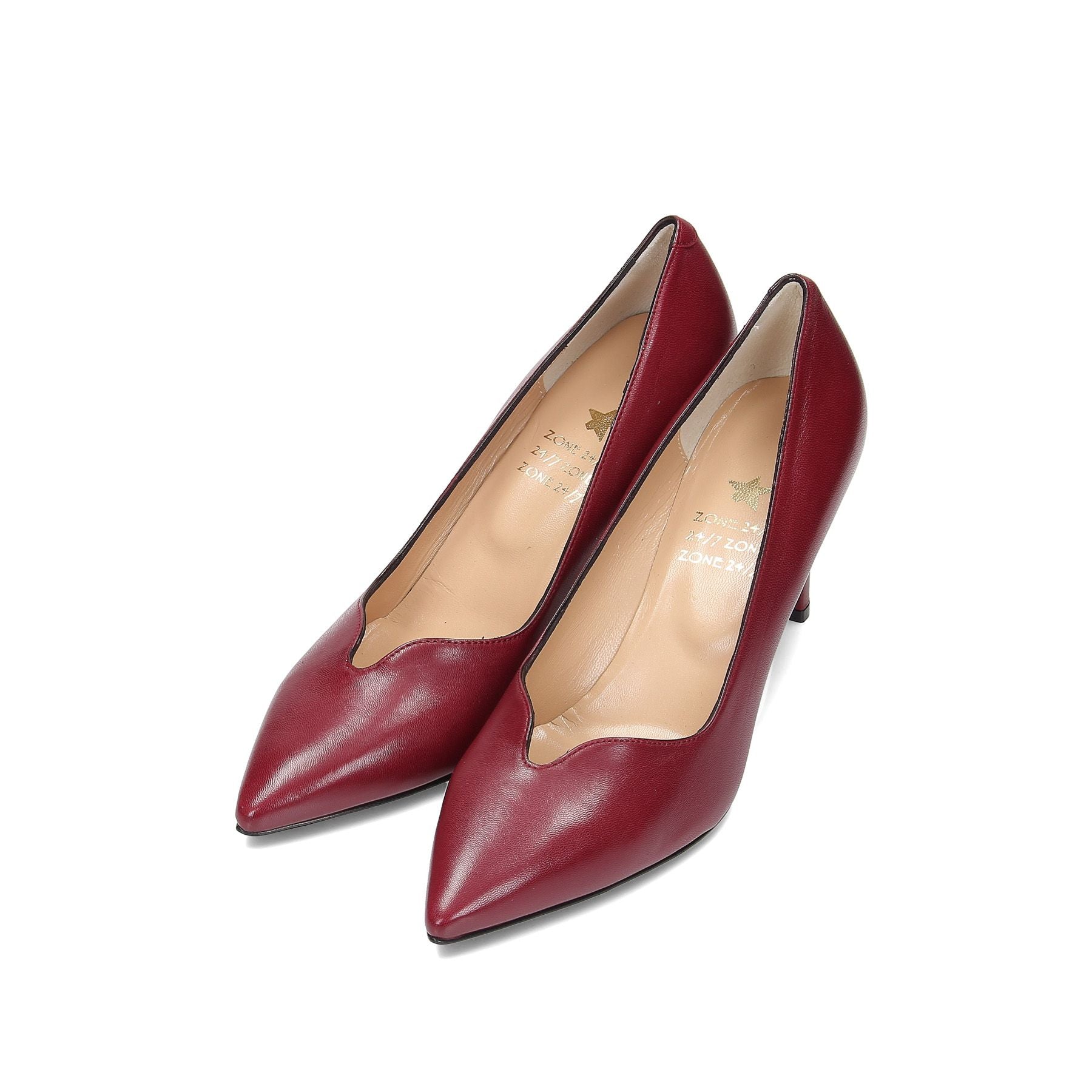Burgundy leather décolleté with V-neckline, 80 cm heel and rubber sole.