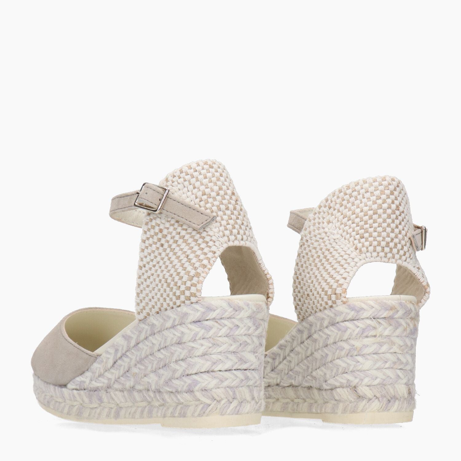 Dove gray suede espadrilles. Round toe. Strap closure. Fabric and leather lining. Rubber sole. 7 cm wedge. Women's Spring/Summer Espadrilles Collection.