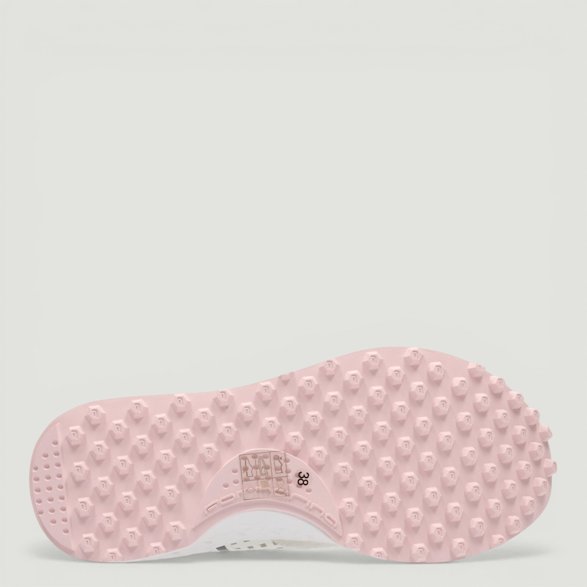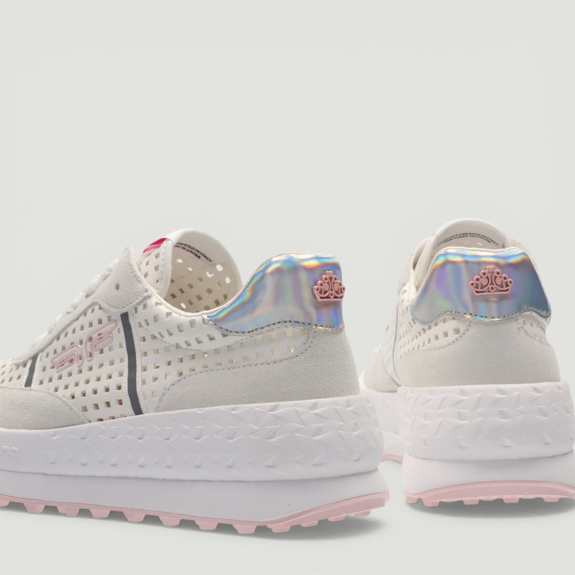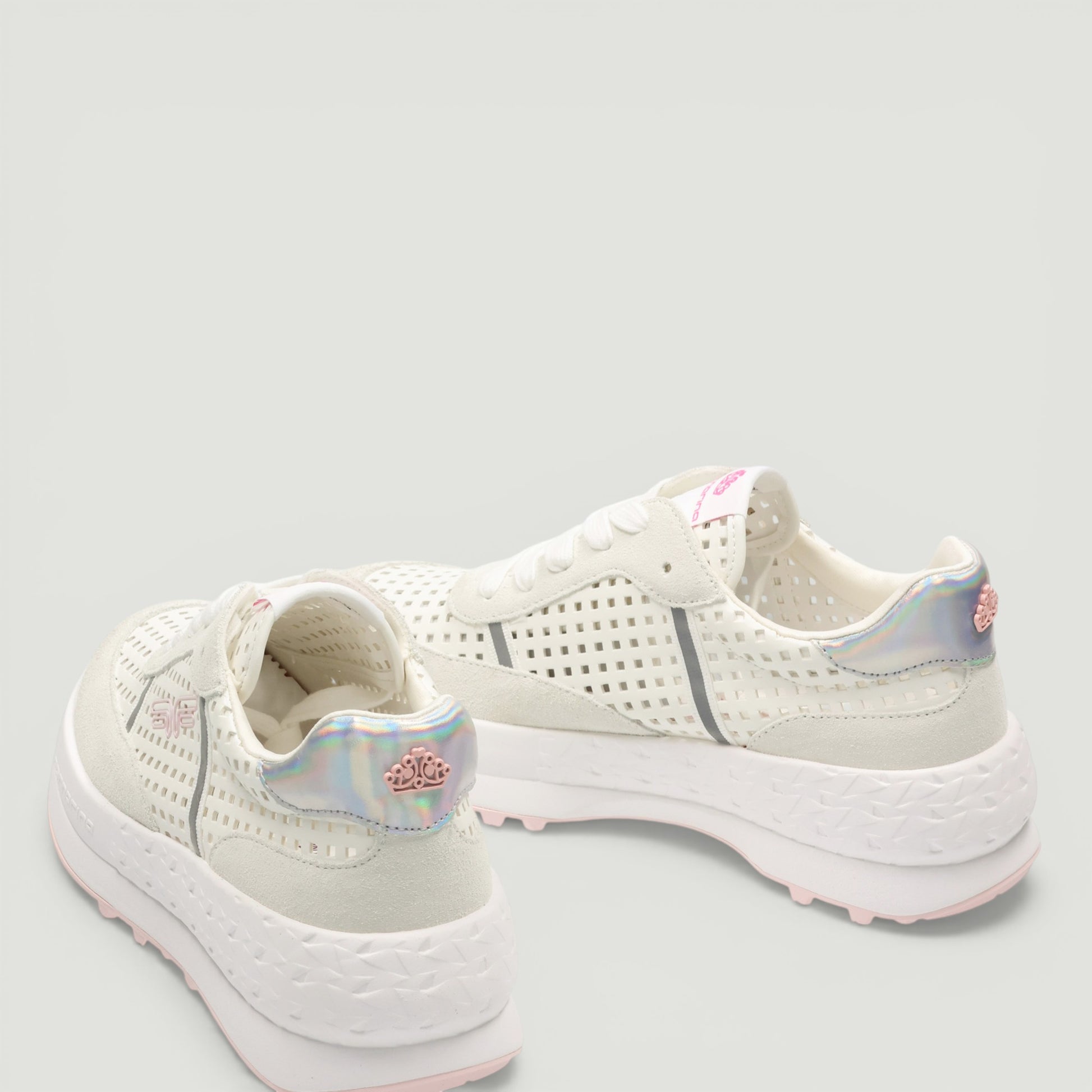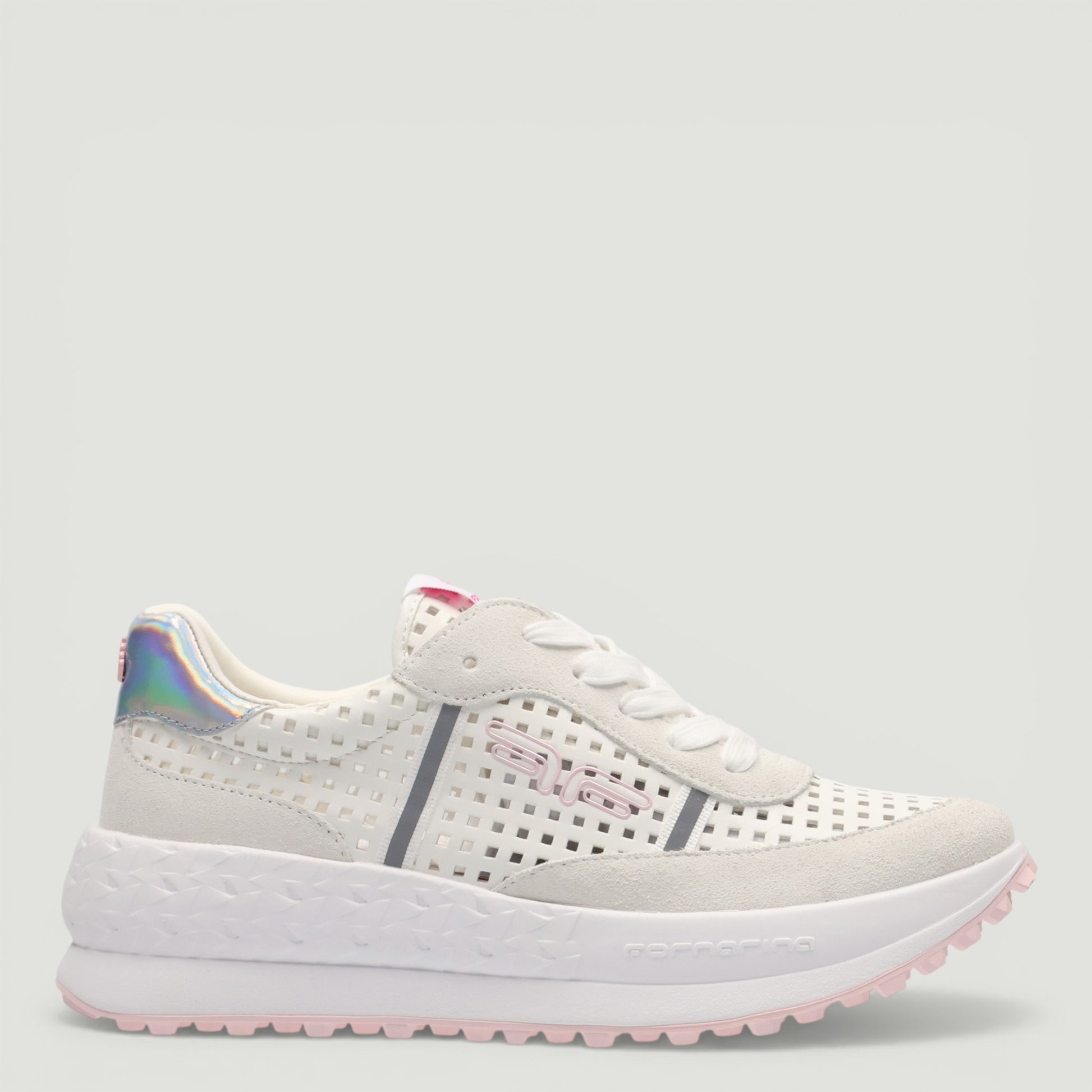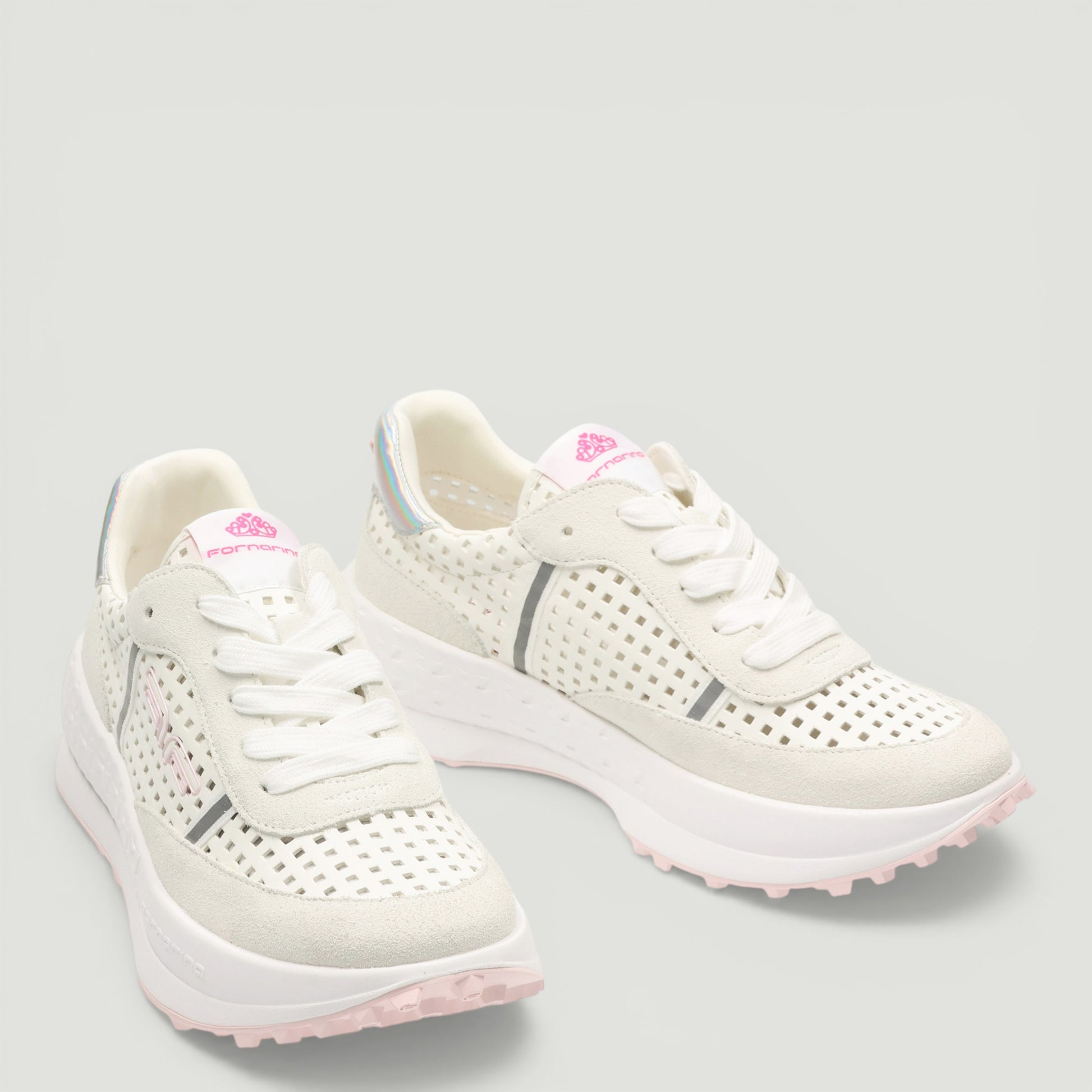 Baskets en écopelle blanche perforée avec empiècements en daim blanc. Intérieur en cuir et tissu avec semelle intérieure amovible. Bande en tissu réfléchissant. Contrefort avec logo. Semelle en caoutchouc avec talon compensé de 5 cm. Collection Fornarina femme.
