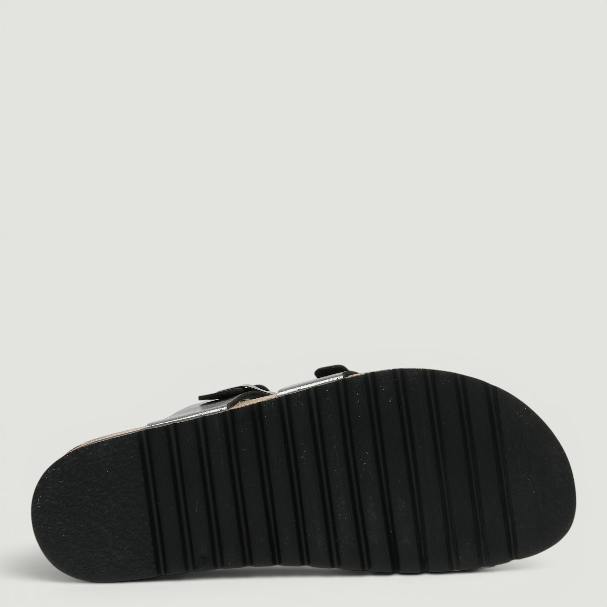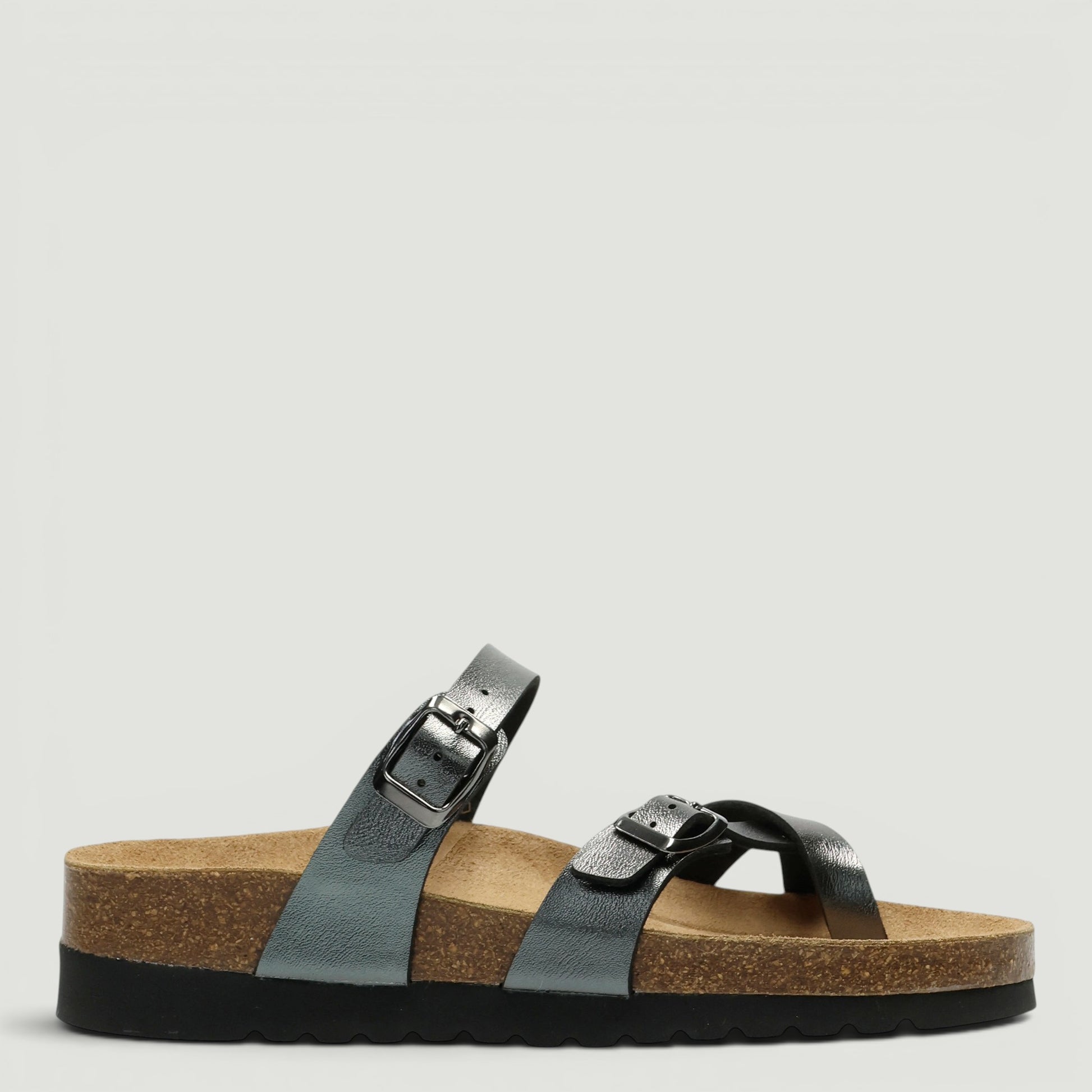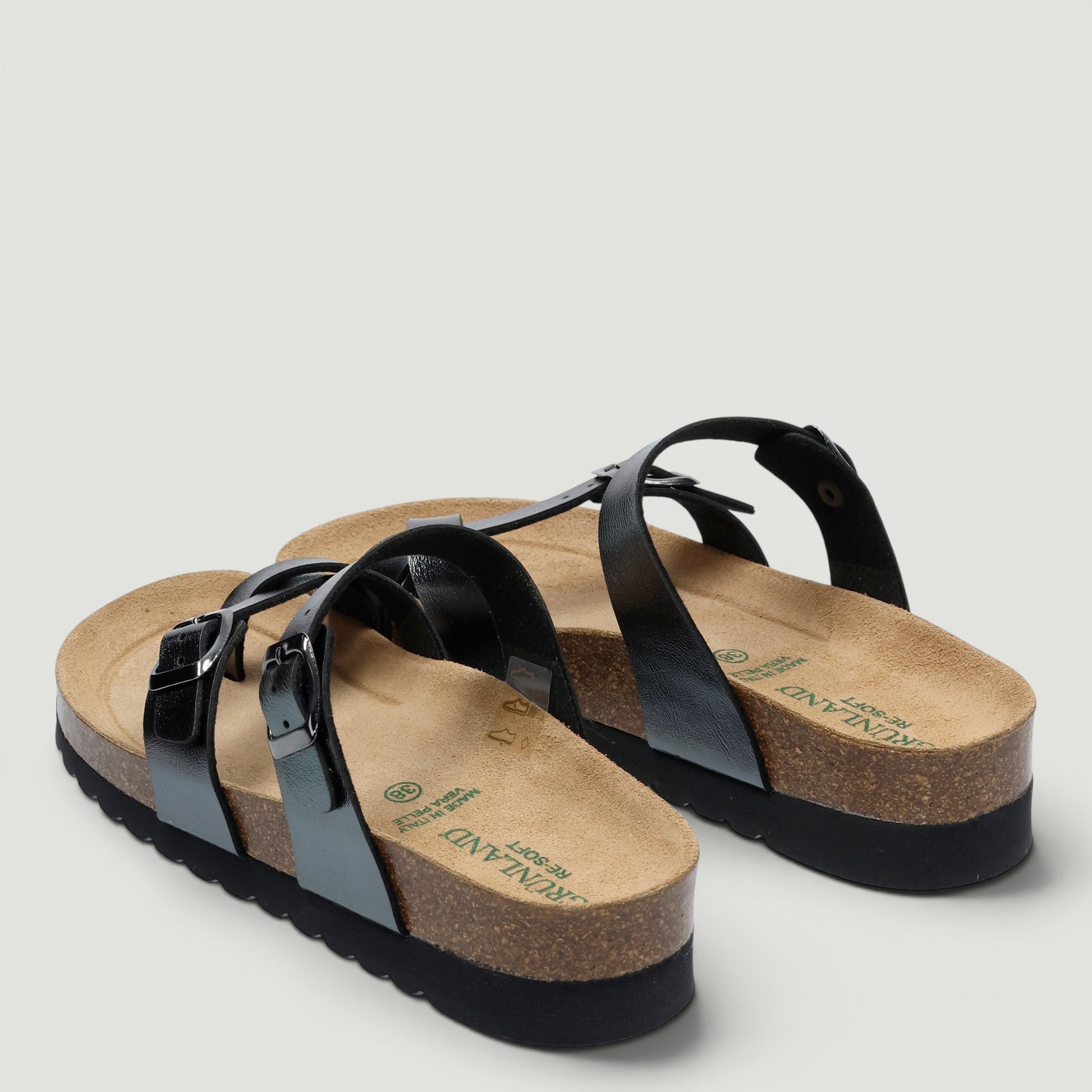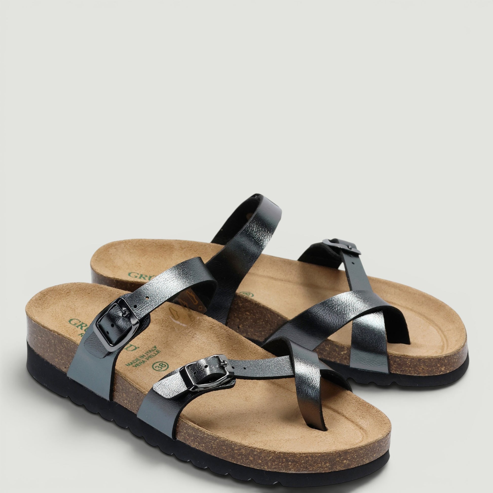 Ciabatte in ecopelle laminata canna di fucile con infradito e fibbia regolabile. Interno in tessuto con sottopiede in pelle Re-Soft imbottito. Suola di 4 cm. Collezione Grunland donna Primavera/Estate.