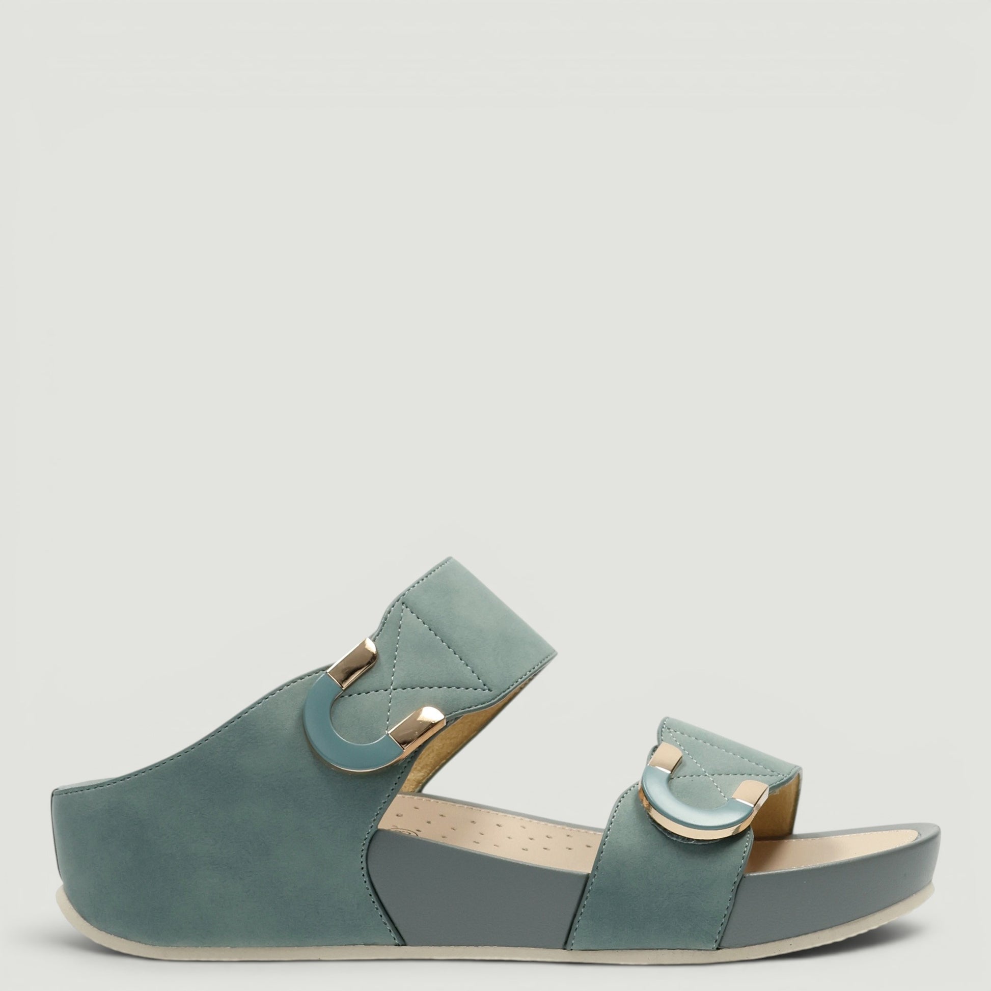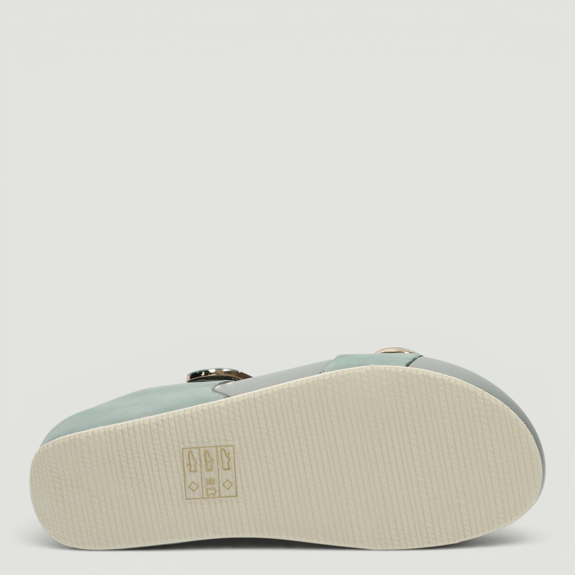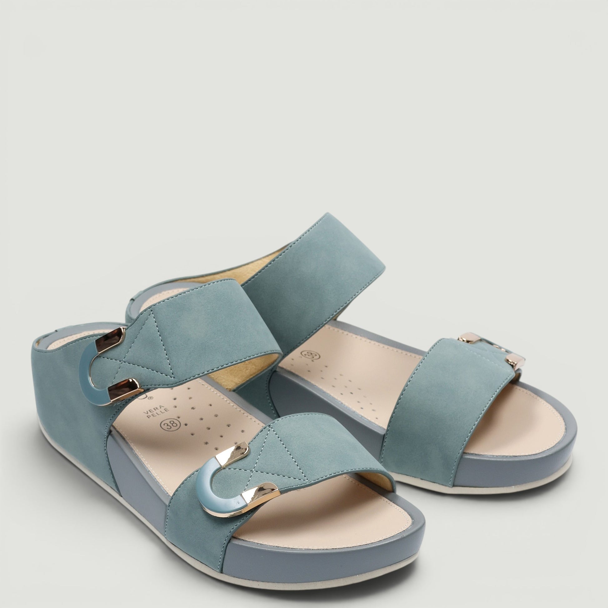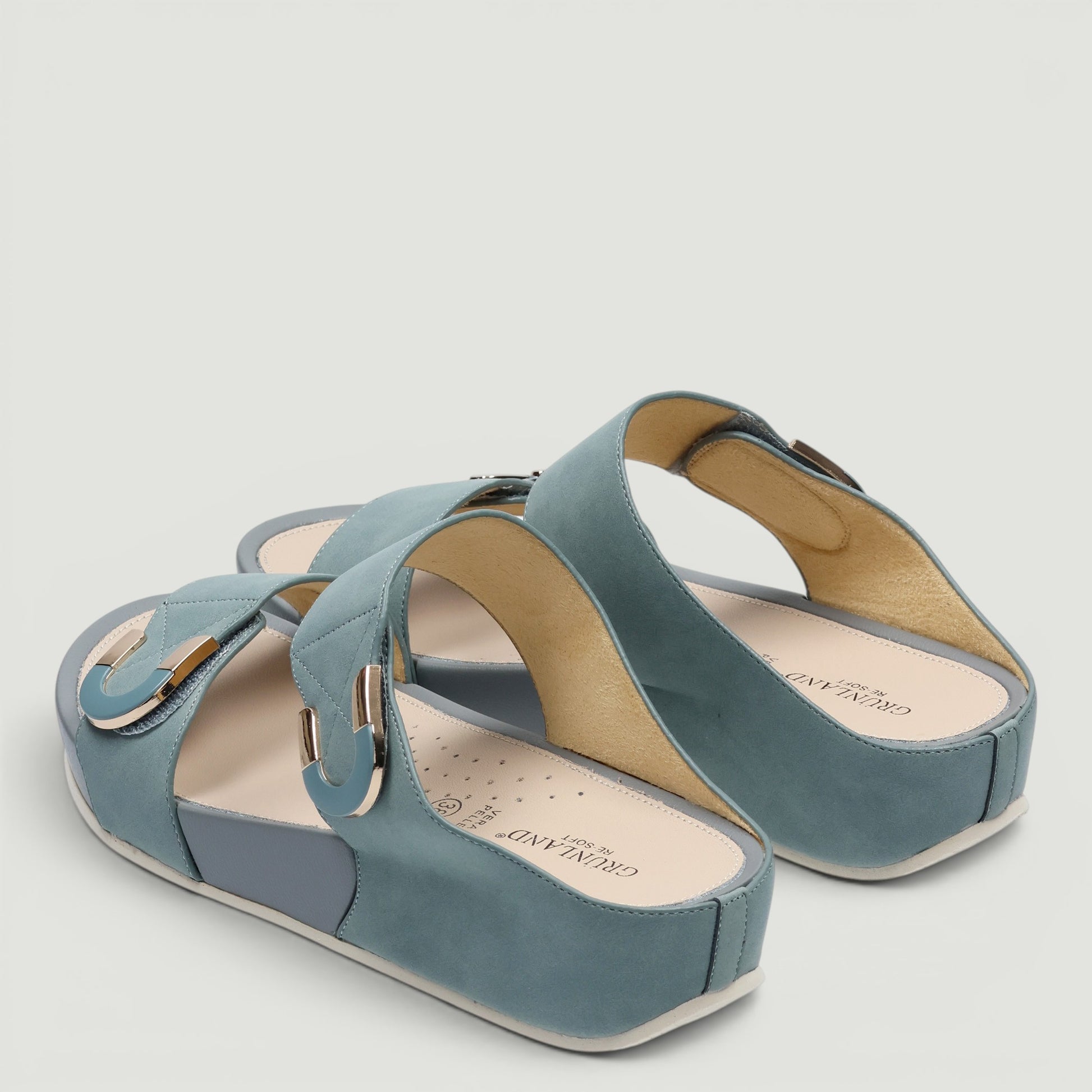 Ciabatta in ecopelle effetto nabuk in azzurro jeans. Interno in microfibra con sottopiede Re-Soft in pelle imbottito. Regolazione tramite doppio velcro con accessori dorati e smaltati. Suola in gomma con zeppa di 4 cm. Collezione Grunland donna Primavera/Estate.