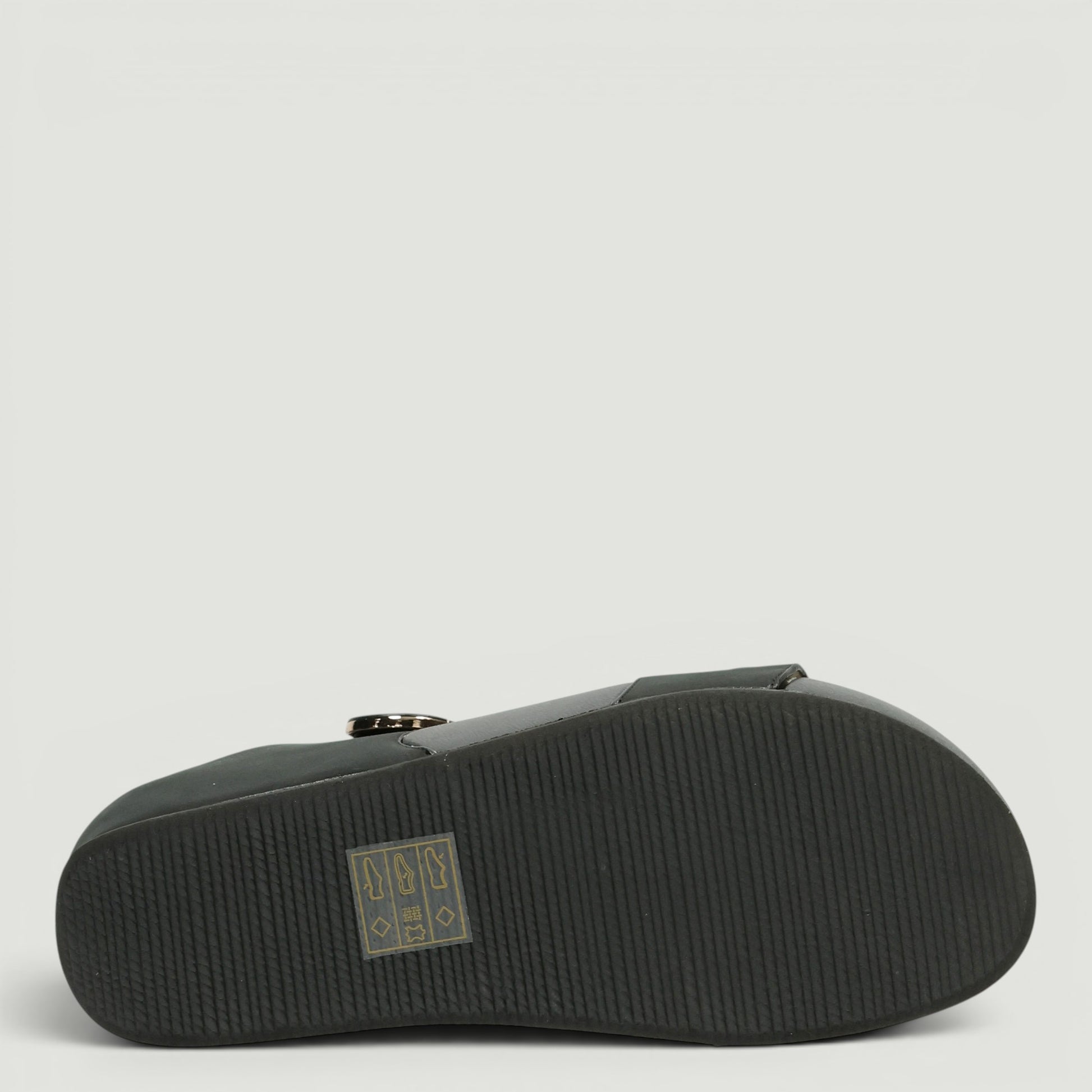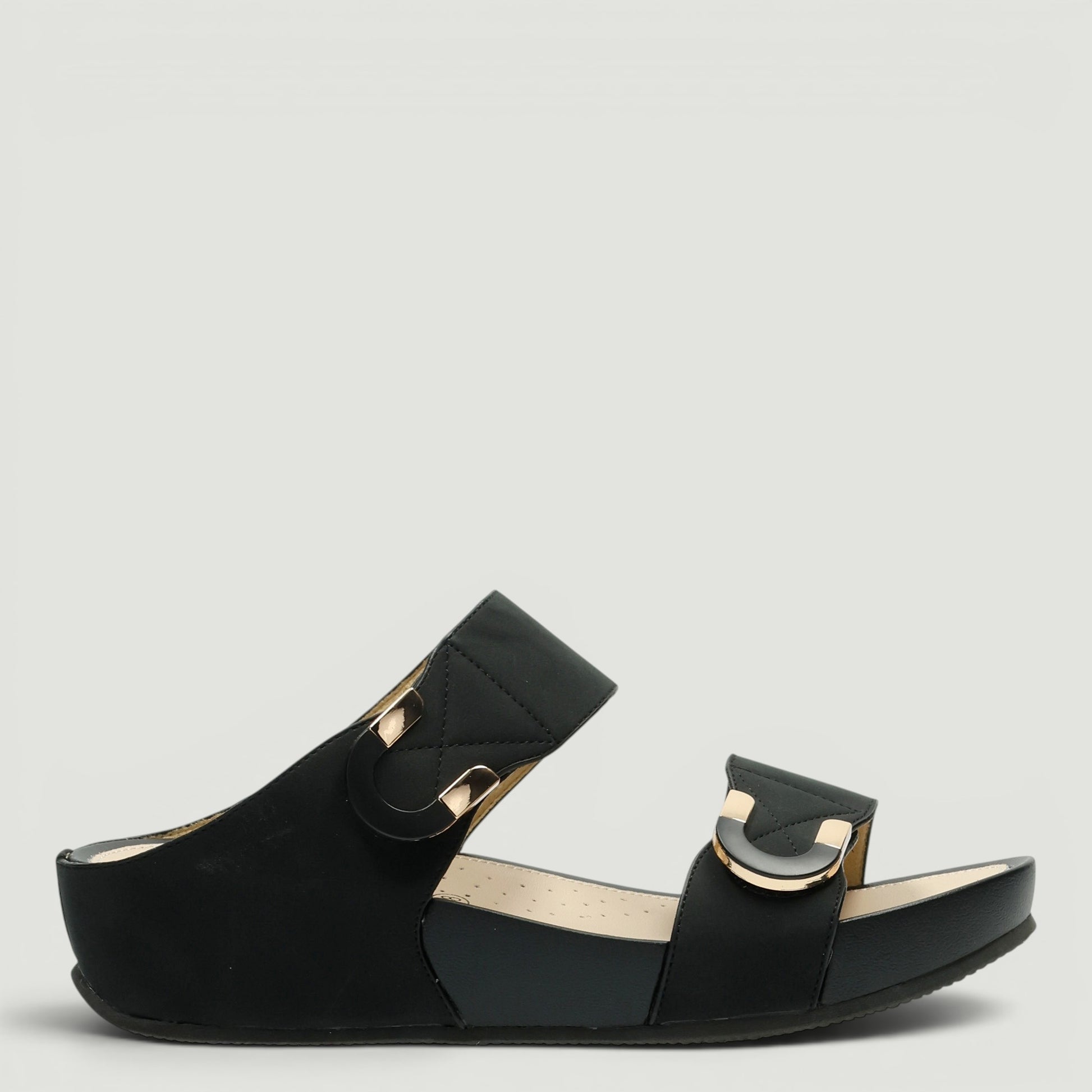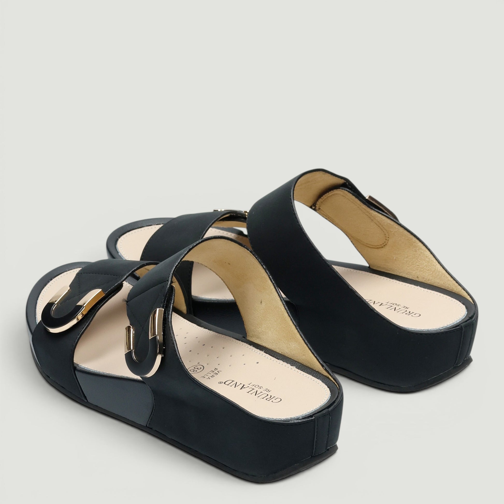 Ciabatta in ecopelle effetto nabuk in nero. Interno in microfibra con sottopiede Re-Soft in pelle imbottito. Regolazione tramite doppio velcro con accessori dorati e smaltati. Suola in gomma con zeppa di 4 cm. Collezione Grunland donna Primavera/Estate.