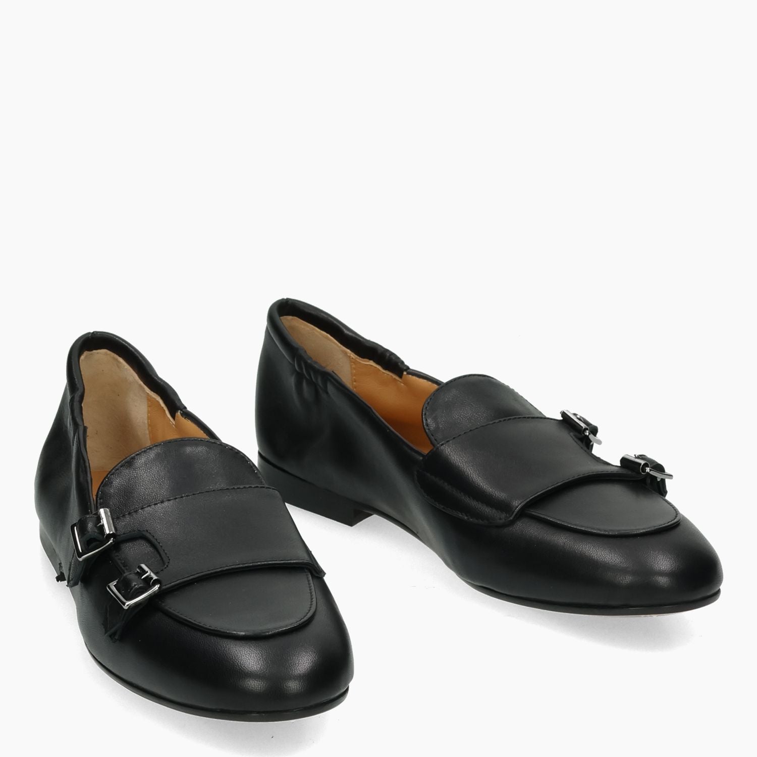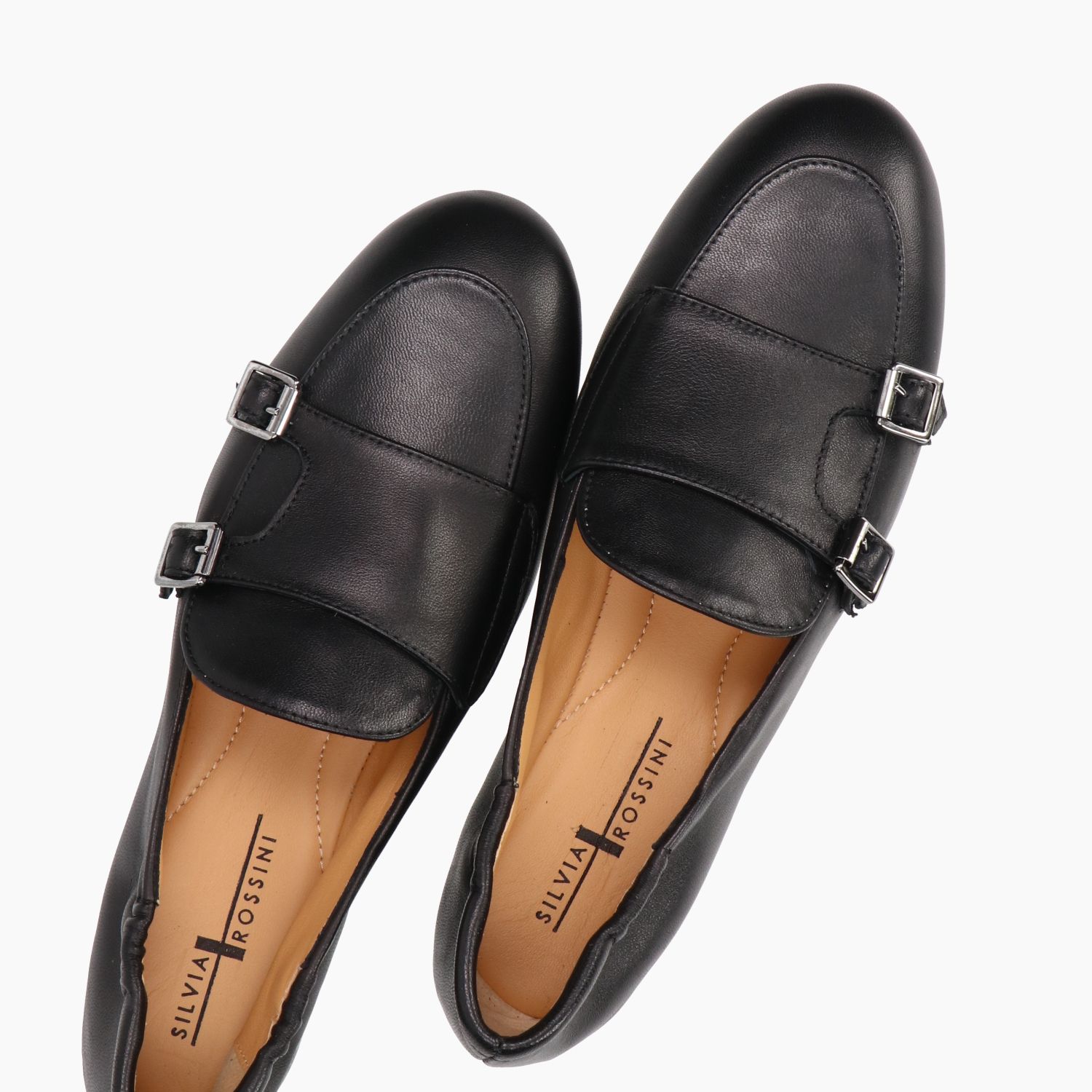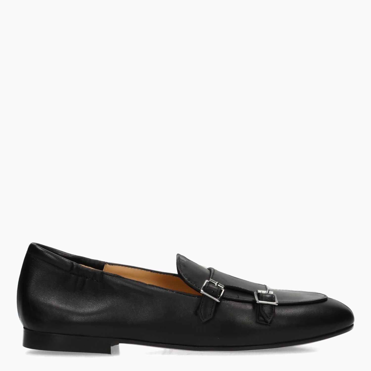 Mocassino in pelle nera con doppia fibba. Interno in pelle. Suola in cuoio con isola in gomma antiscivolo. Lavorazione a sacchetto. Tacco di 1,5 cm. Collezione Silvia Rossini donna primavera/estate.