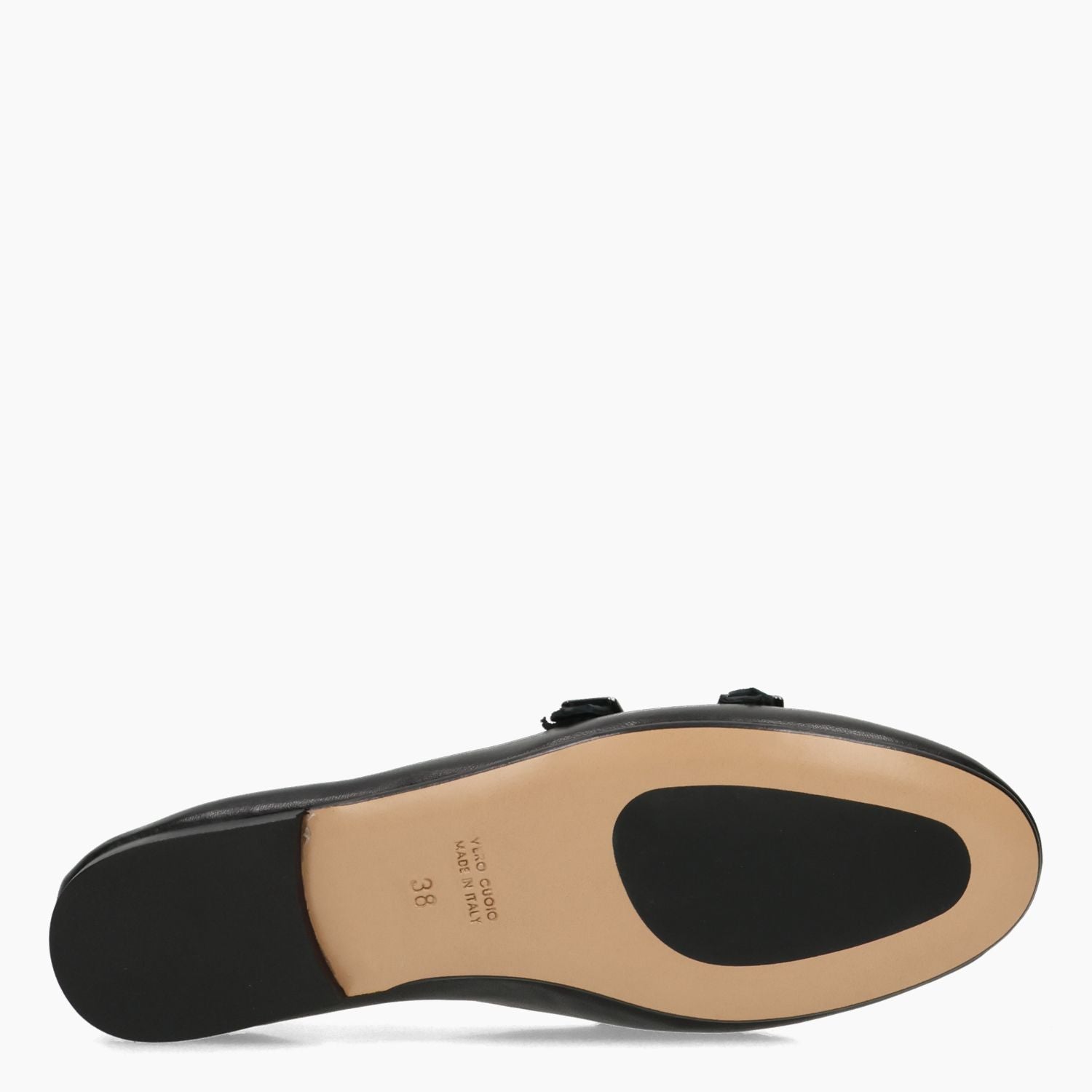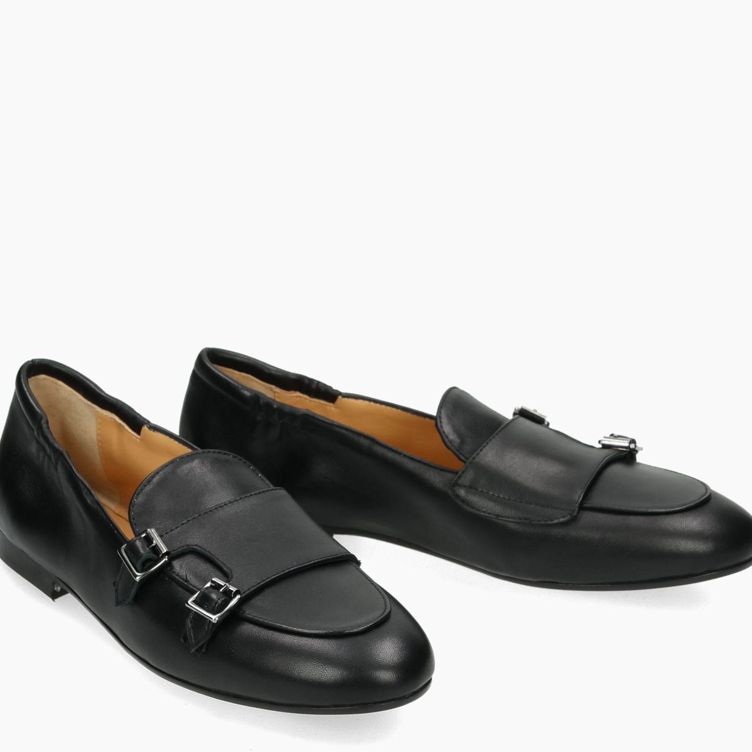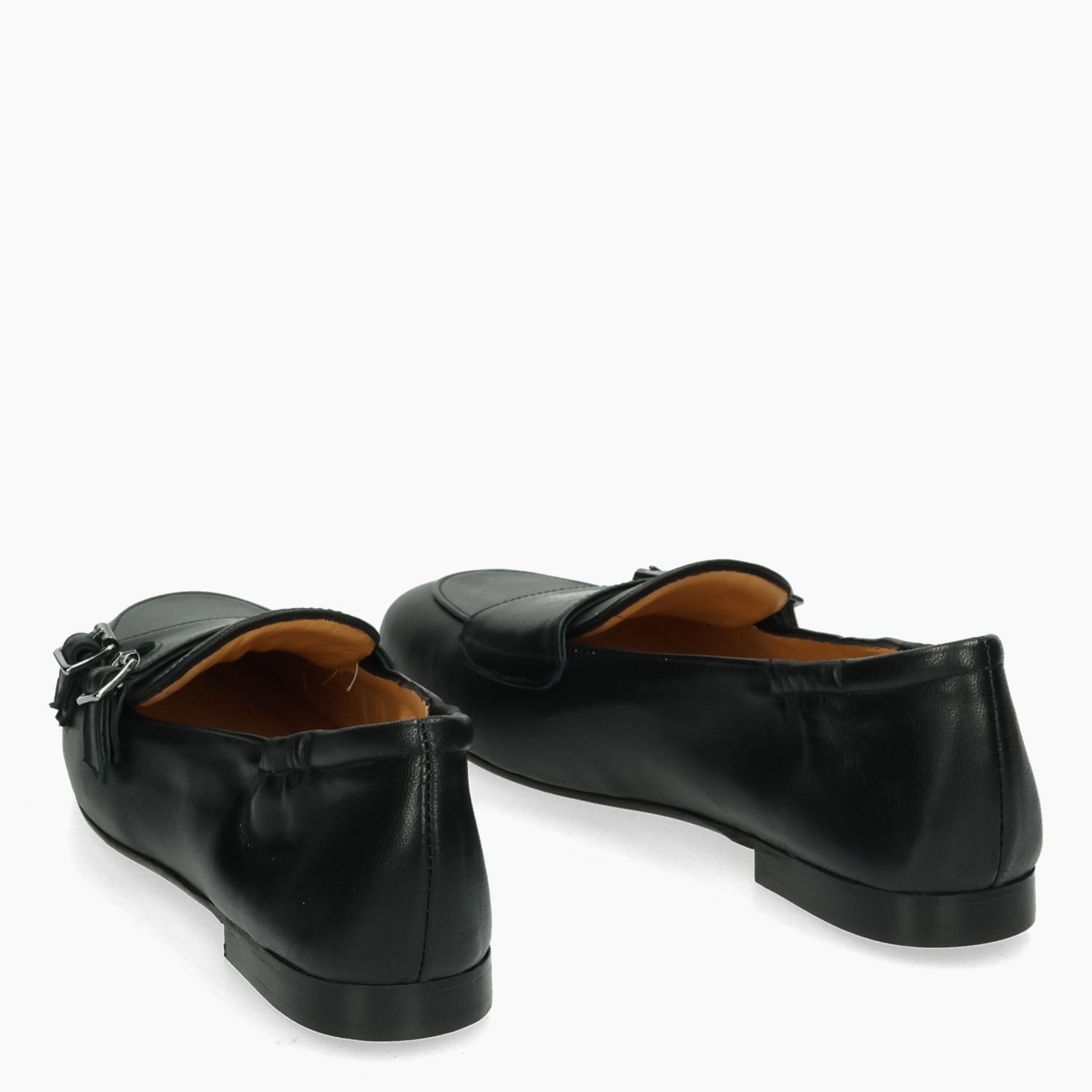 Mocassino in pelle nera con doppia fibba. Interno in pelle. Suola in cuoio con isola in gomma antiscivolo. Lavorazione a sacchetto. Tacco di 1,5 cm. Collezione Silvia Rossini donna primavera/estate.